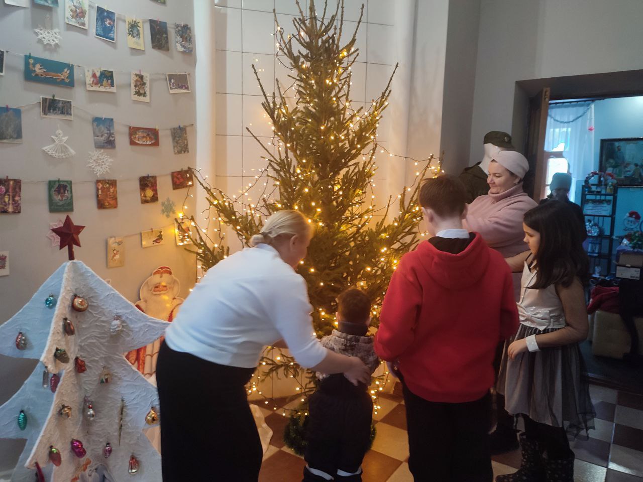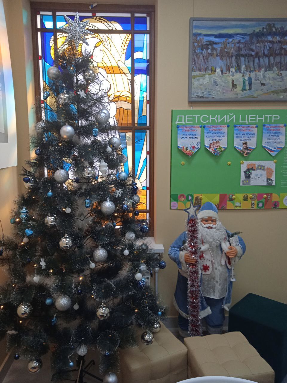При входе в музей посетителей встречает величественная елка высотой более двух метров, украшенная золотыми и серебряными шарами, гирляндами из мерцающих огней и изысканными игрушками, выполненными в традиционном русском стиле. Ветви елки изящно усыпаны снежным декором, что создает эффект зимней сказки.