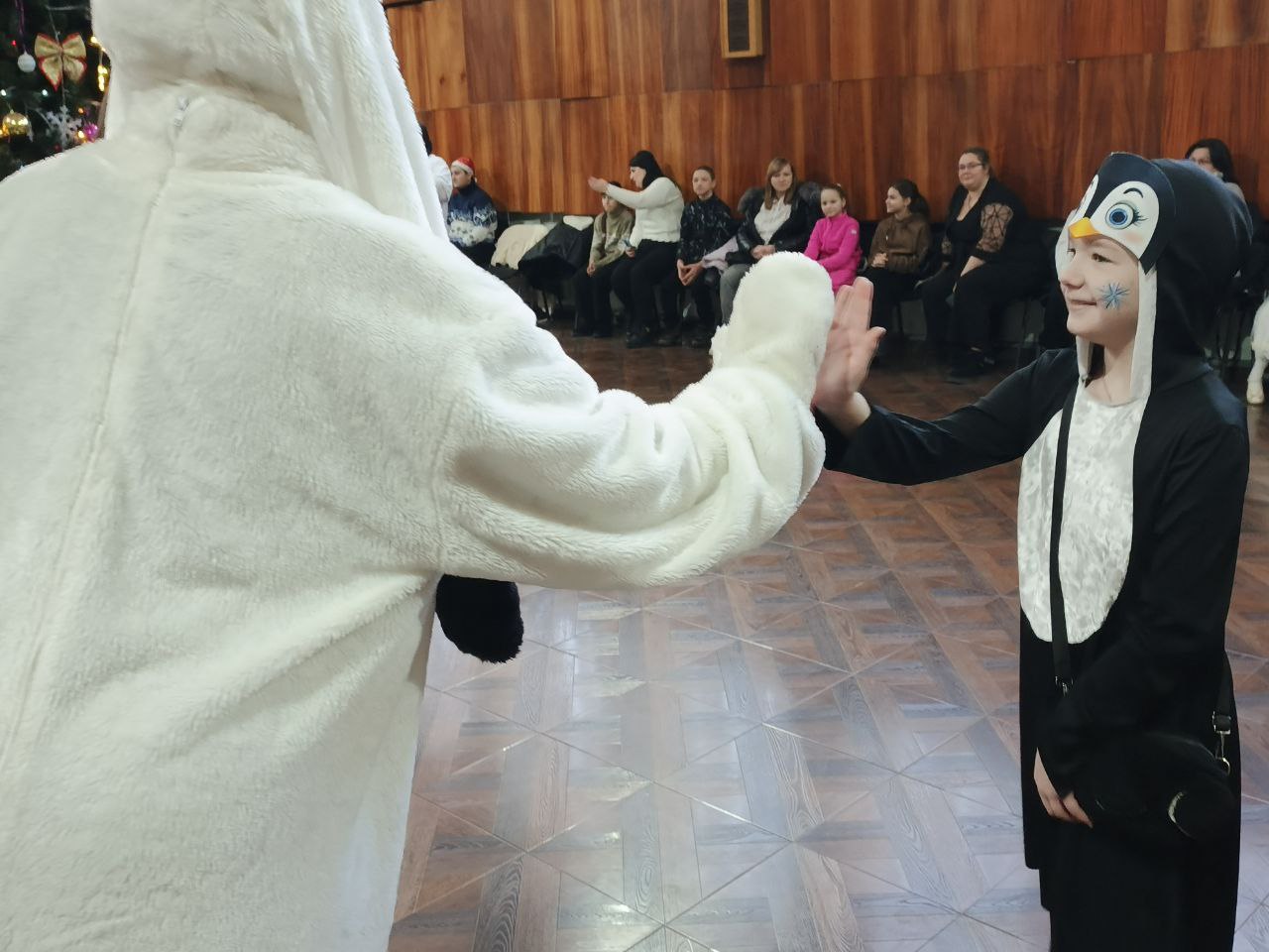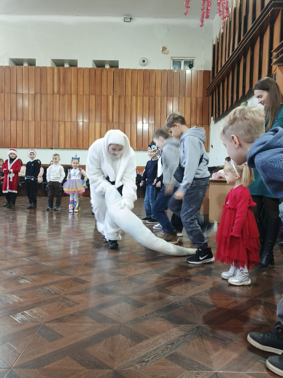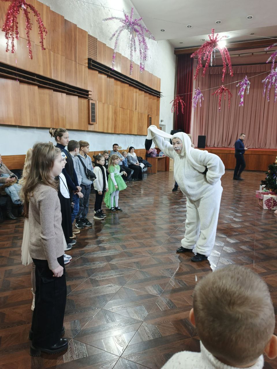 Снегурочка со своим другом зайчиком провели для детей зажигательные танцы под новогодние мелодии, создавая праздничное