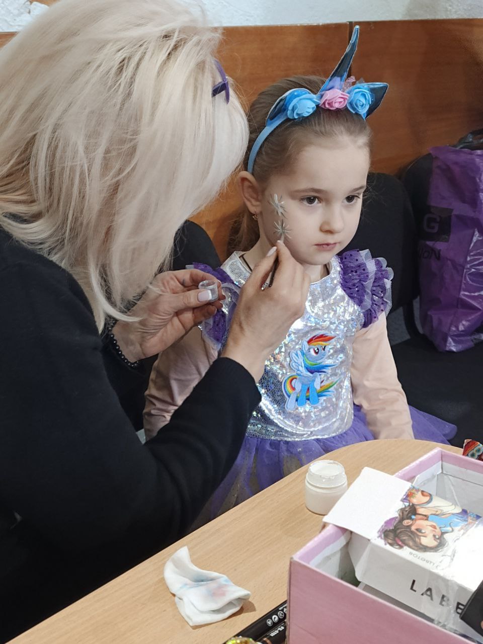 С первых минут мероприятия зал наполнился звонким детским смехом. На празднике была организована зона аквагрима, где дети с восторгом выбирали рисунки и превращали свои лица в яркие и красочные образы.