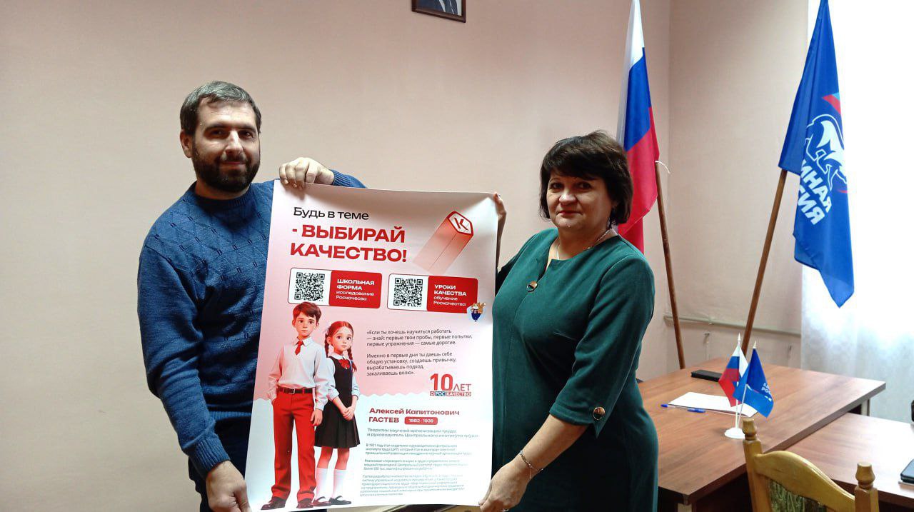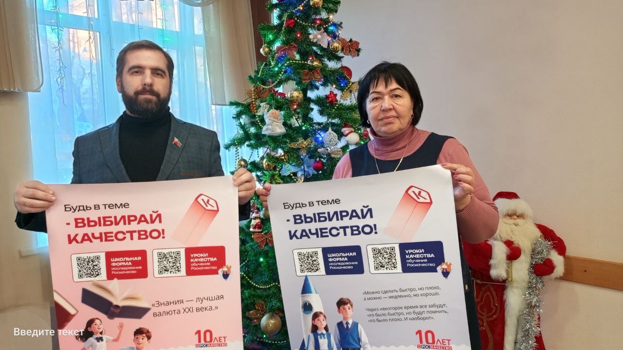 Координатор партийного проекта «Крепкая семья» в ЛНР Тихон Валентинович Гончаров торжественно вручил плакаты от Роскачества директору гимназии № 30 имени Н. Т. Фесенко г. Луганска Лине Анатольевне Вокаловой и директору ГБОУ ЛНР "Краснолучский УВК №6 "Созвездие" Светлане Владимировне Гончаровой.