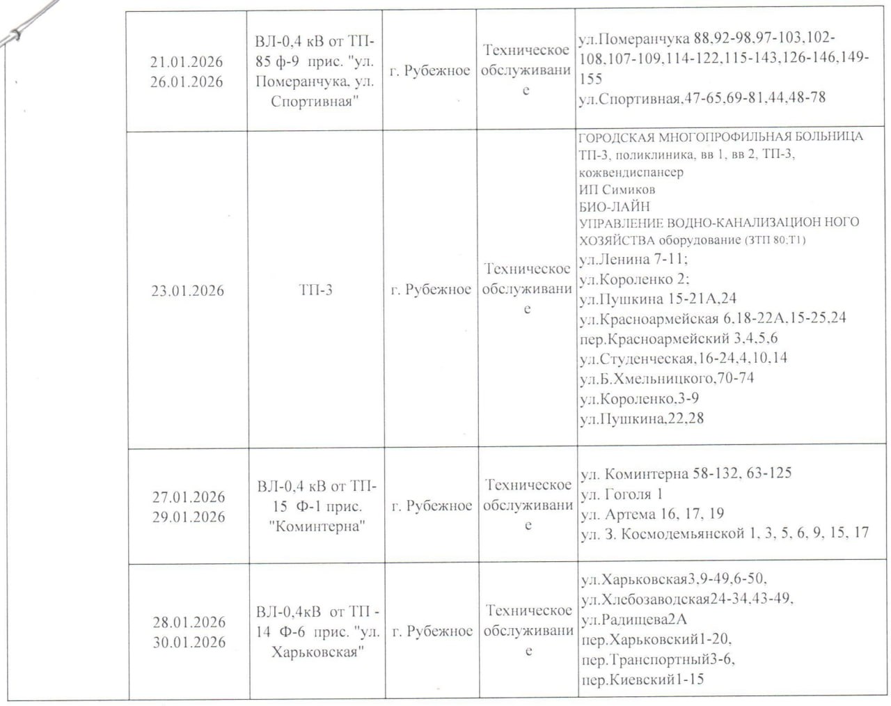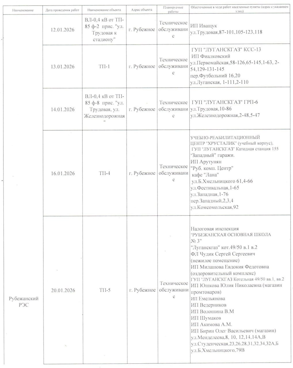 Рубежанский РЭС «Луганскэнерго», подразделение АО «Юго-Западная ЭСК», ИНФОРМИРУЕТ о корректировке плановых отключений по Рубежанскому РЭС на январь 2025
