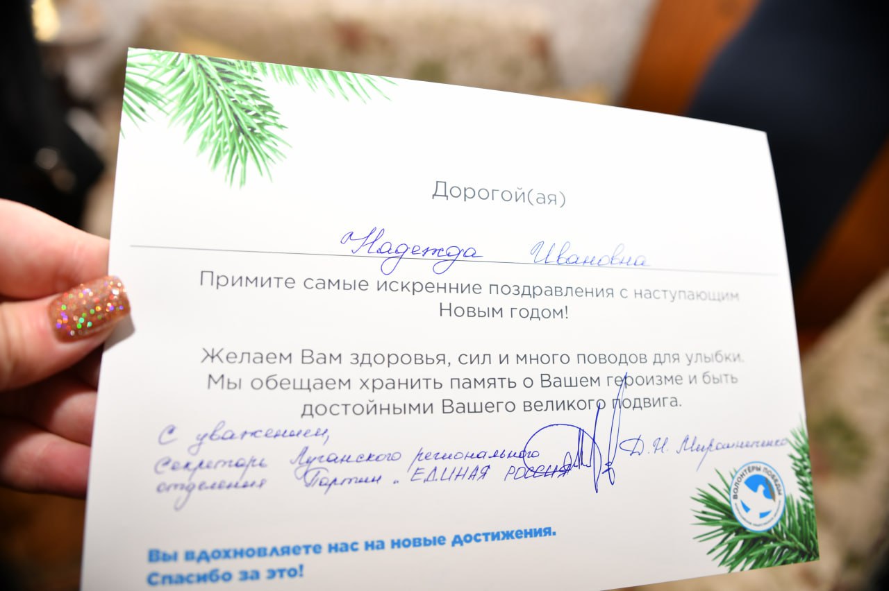 С наступающими Новогодними праздниками единороссы поздравили ветеранов ВОв Полину Леонтьевну Солохину и Надежду Ивановну Крылову, передали подарки от «Единой России» и поздравительные открытки Секретаря Луганского регионального отделения Партии «Единая Россия» Дениса Мирошниченко.