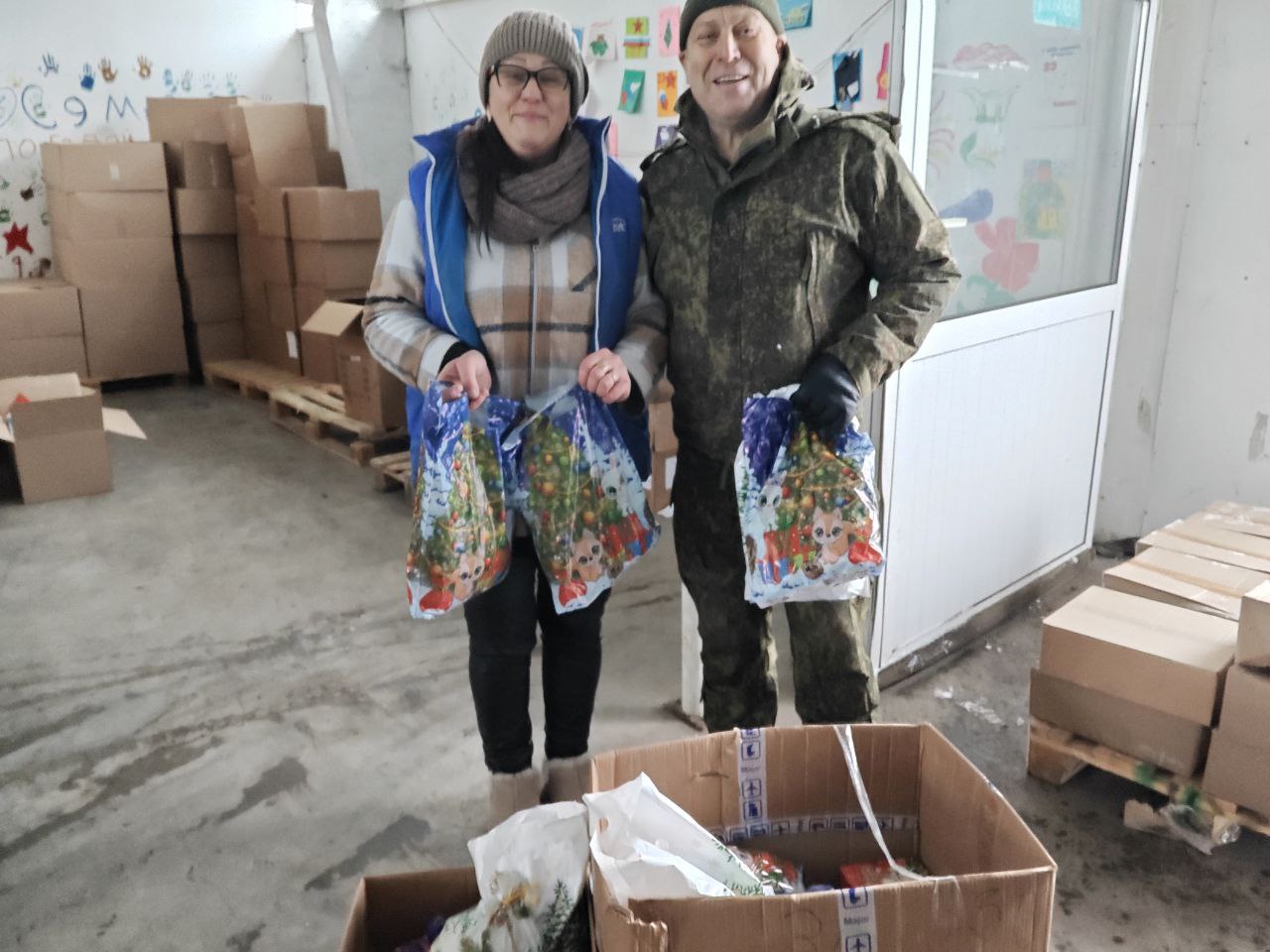 Волонтеры гуманитарного центра «Единая Россия» поздравили наших защитников с наступающим Новым Годом, а также передали на передовую штурмовой роте новогодние сладкие подарки, питьевую воду, теплые носки и термобелье.