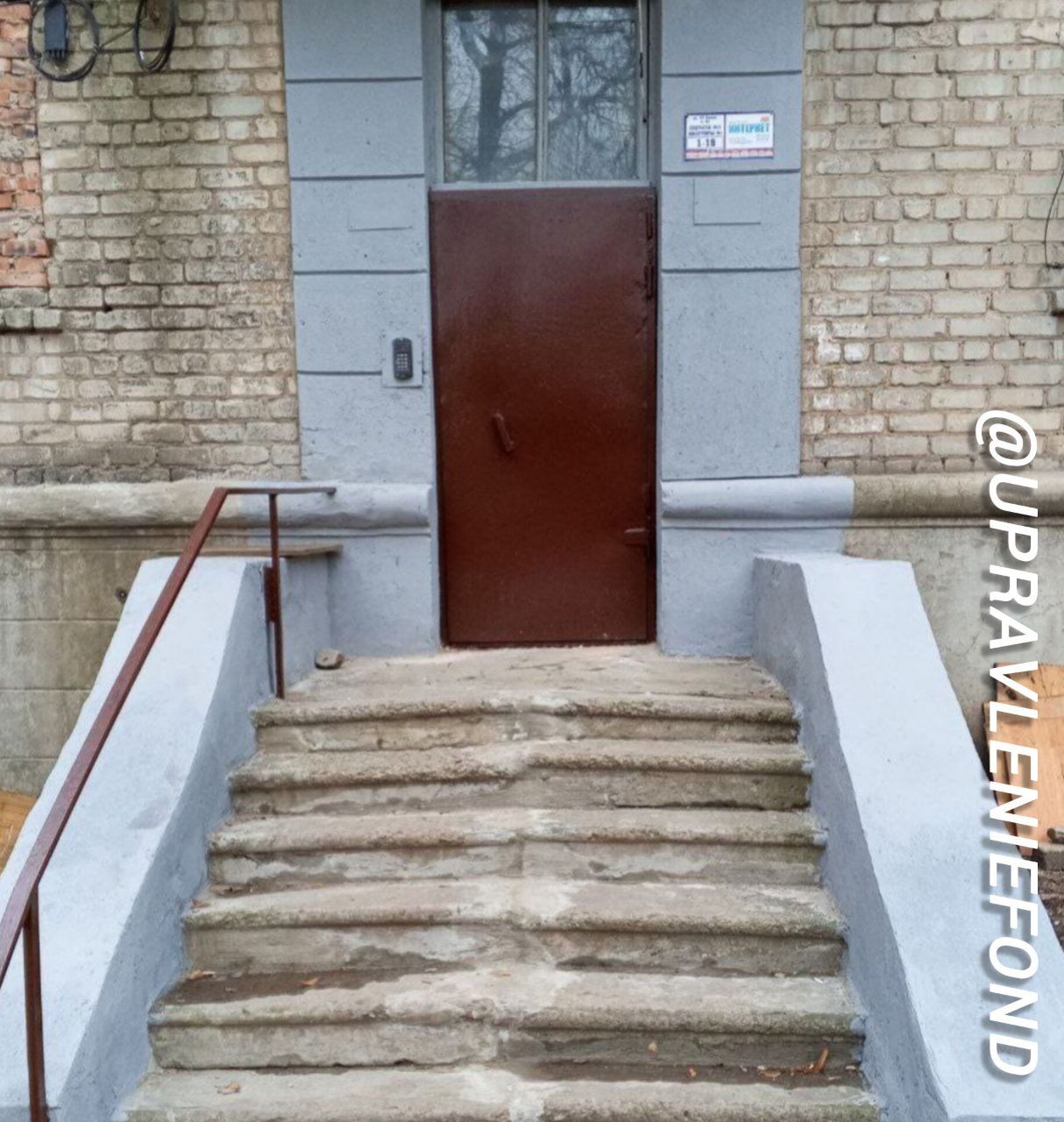На фото обновление входной группы подъезда по адресу ул. Героя России Зозулина В. Н., д. 23, 1 под.Выполнены работы: ремонт ступеней, тумб, покраска двери, покраска фасада.