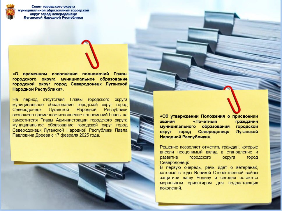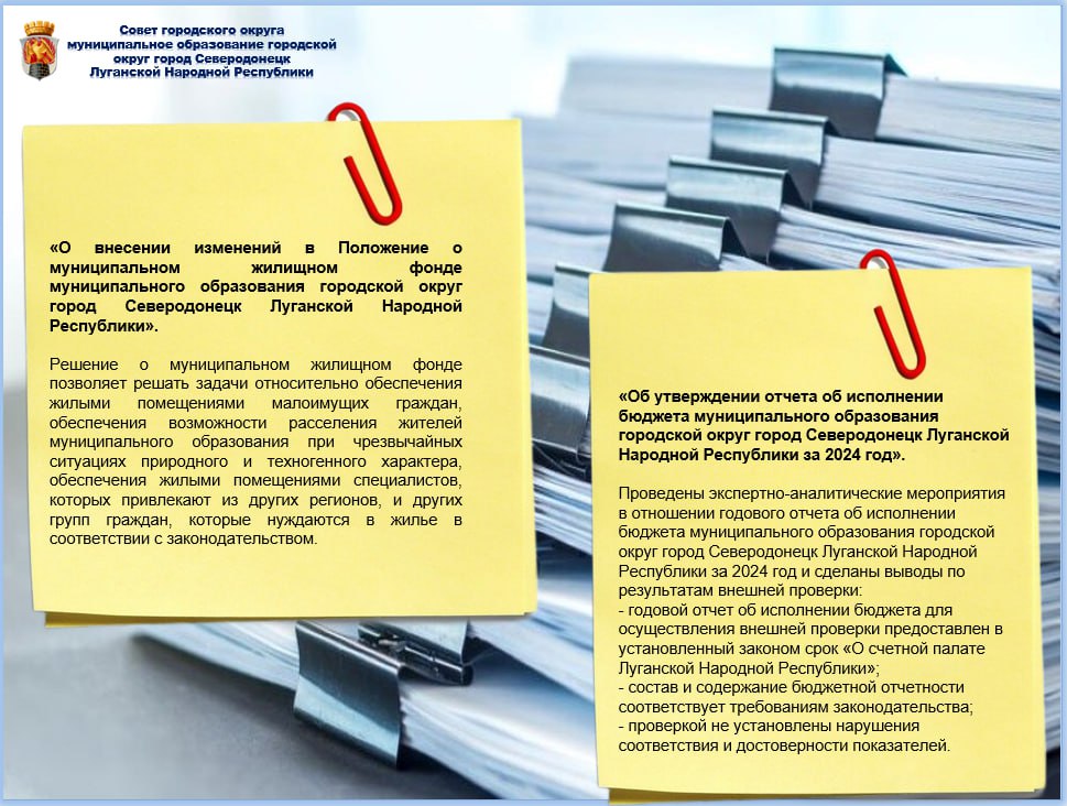 В течение 2025 года Советом городского округа город Северодонецк было принято 67 решений, из них 29 являются нормативно-правовыми актами Принятые решения обеспечивают жизнедеятельность муниципалитета и его вхождение в единое правовое пространство Российской Федерации. О наиболее актуальных и важных из них - в информационных карточках.