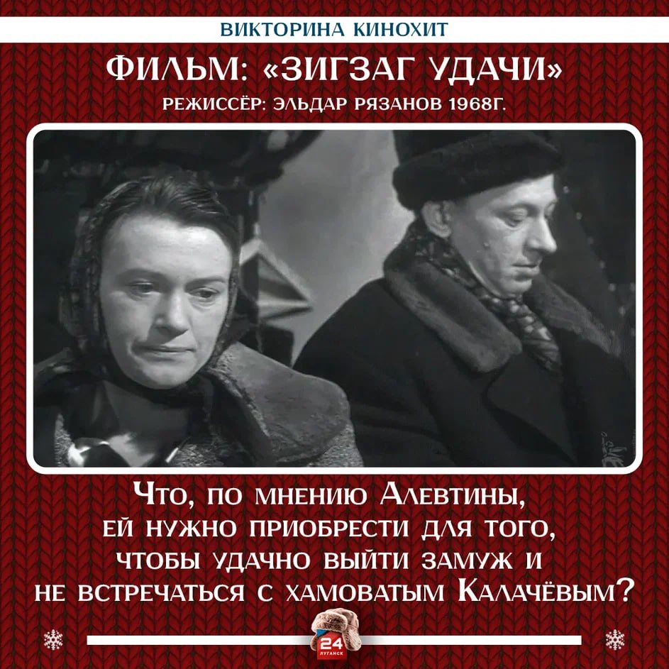 Второй вопрос викторины звучит так: «Что, по мнению Алевтины, ей нужно приобрести для того, чтобы удачно выйти замуж и не встречаться с хамоватым Калачёвым?»