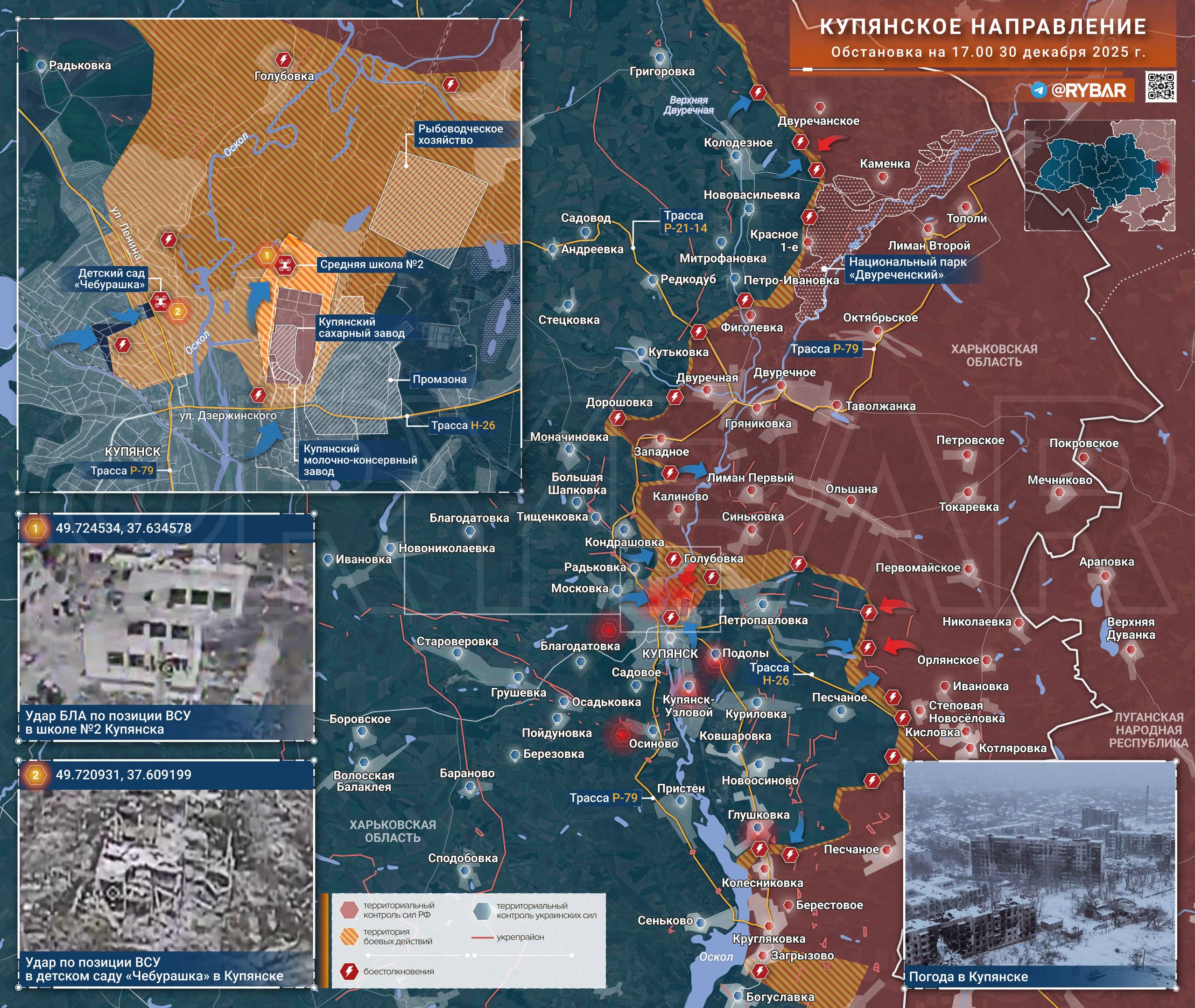 «Обстановка южнее все так же остается скрытой «туманом войны», однако вполне вероятно, что ВС РФ покинули позиции в центре города с целью избежать попадания в «огневой мешок». На левобережье российские подразделения сохраняют контроль над Купянским сахарным заводом и частью молочноконсервного комбината, отражая накаты противника. На этом участке ВСУ так же бросили часть своих резервов на рассечение порядков ГВ «Запад» — украинские формирования были замечены на территории средней школы №2», - пишет канал Звинчука.