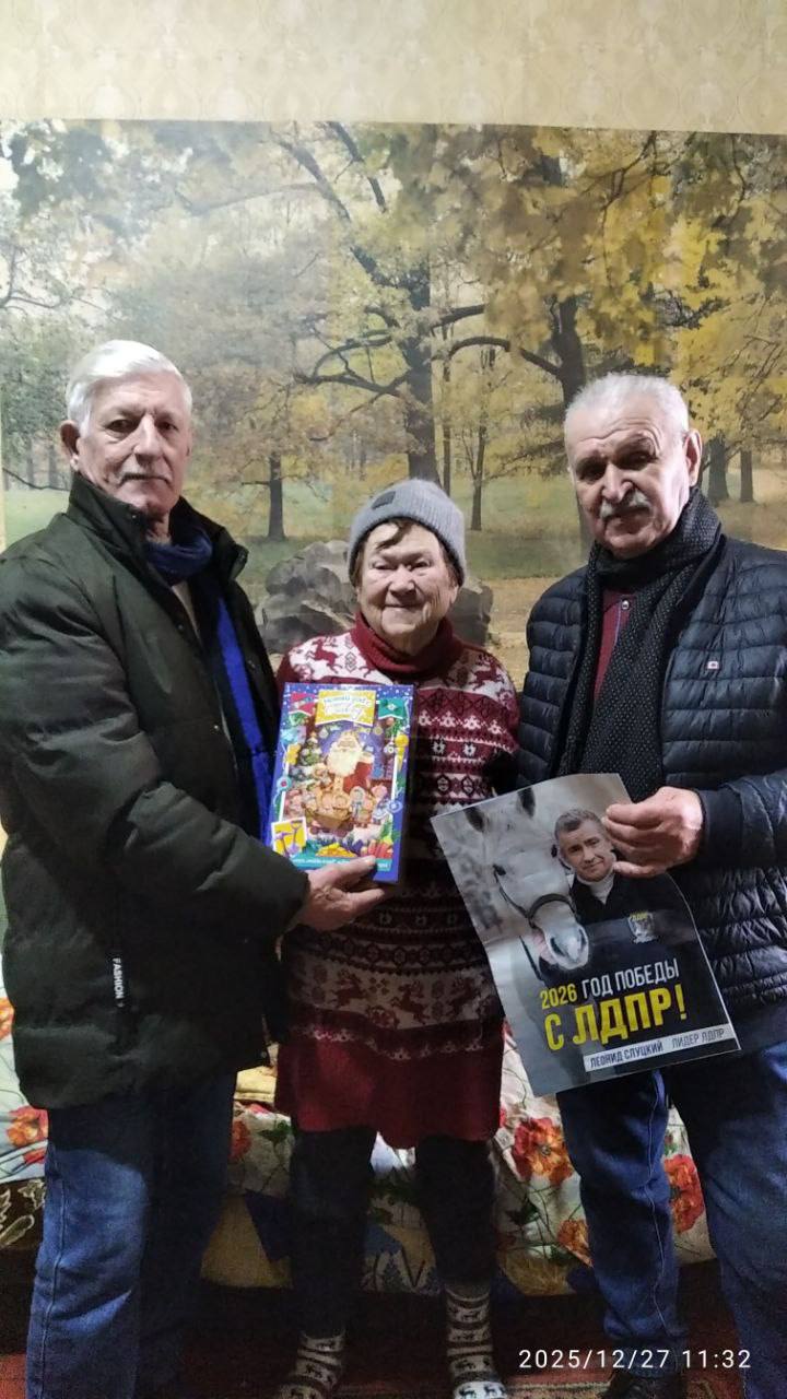 Повод для встречи - поздравление с наступающим праздником и вручение небольшого, но очень приятного сюрприза от местного отделения ЛДПР- новогоднего подарка со словами добрых пожеланий.