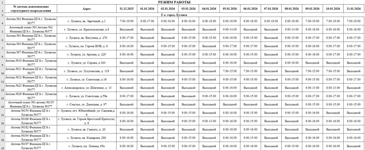 Минздрав ЛНР опубликовал график работы аптек Лугмедфарм на новогодние и рождественские дни.