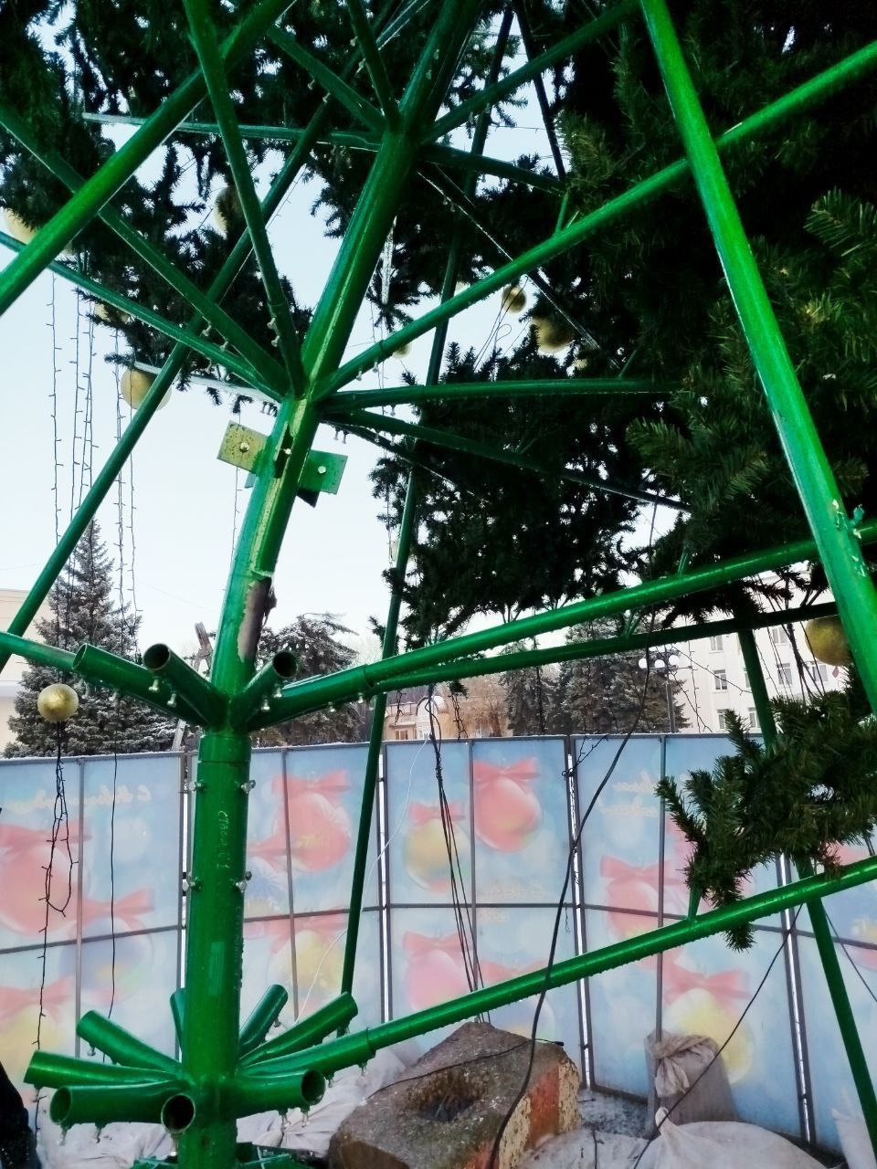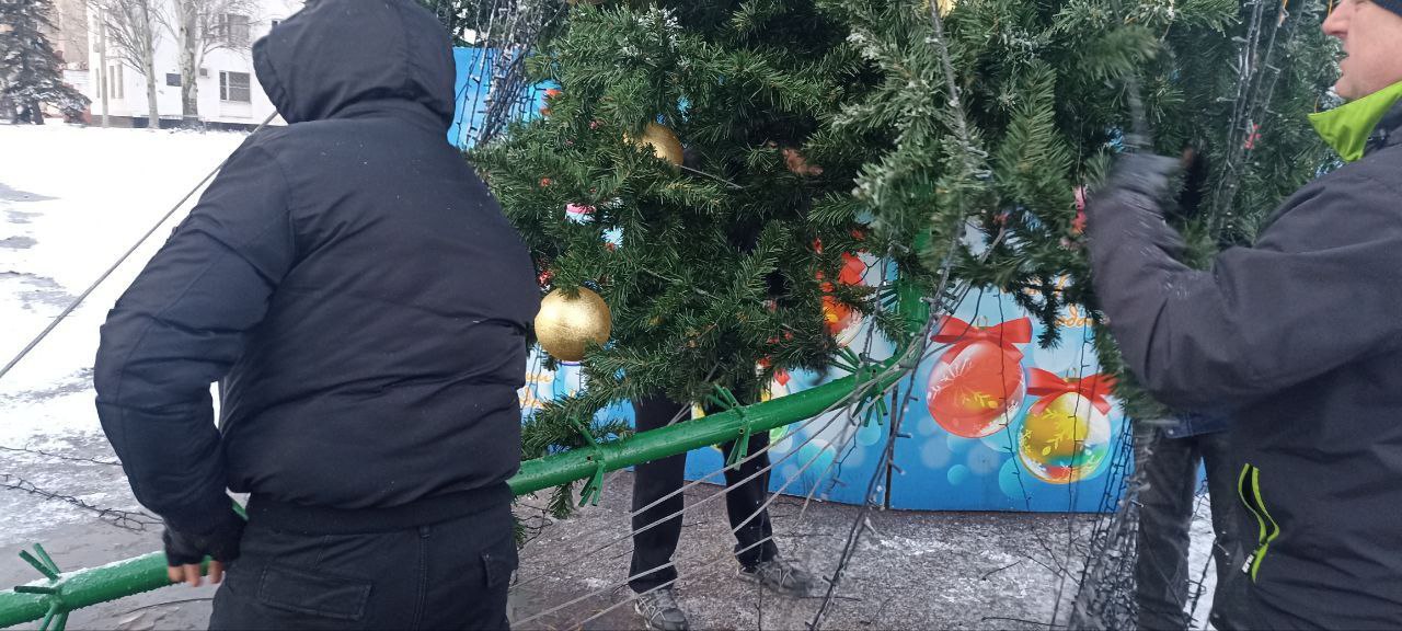Сегодня утром специалисты МУП «Комбинат коммунальных услуг города Первомайска» совместно с сотрудниками ГЦКД "Заря" и отдела культуры, молодёжи и спорта Администрации приступили к демонтажу новогодней ёлки на площади имени Ленина.