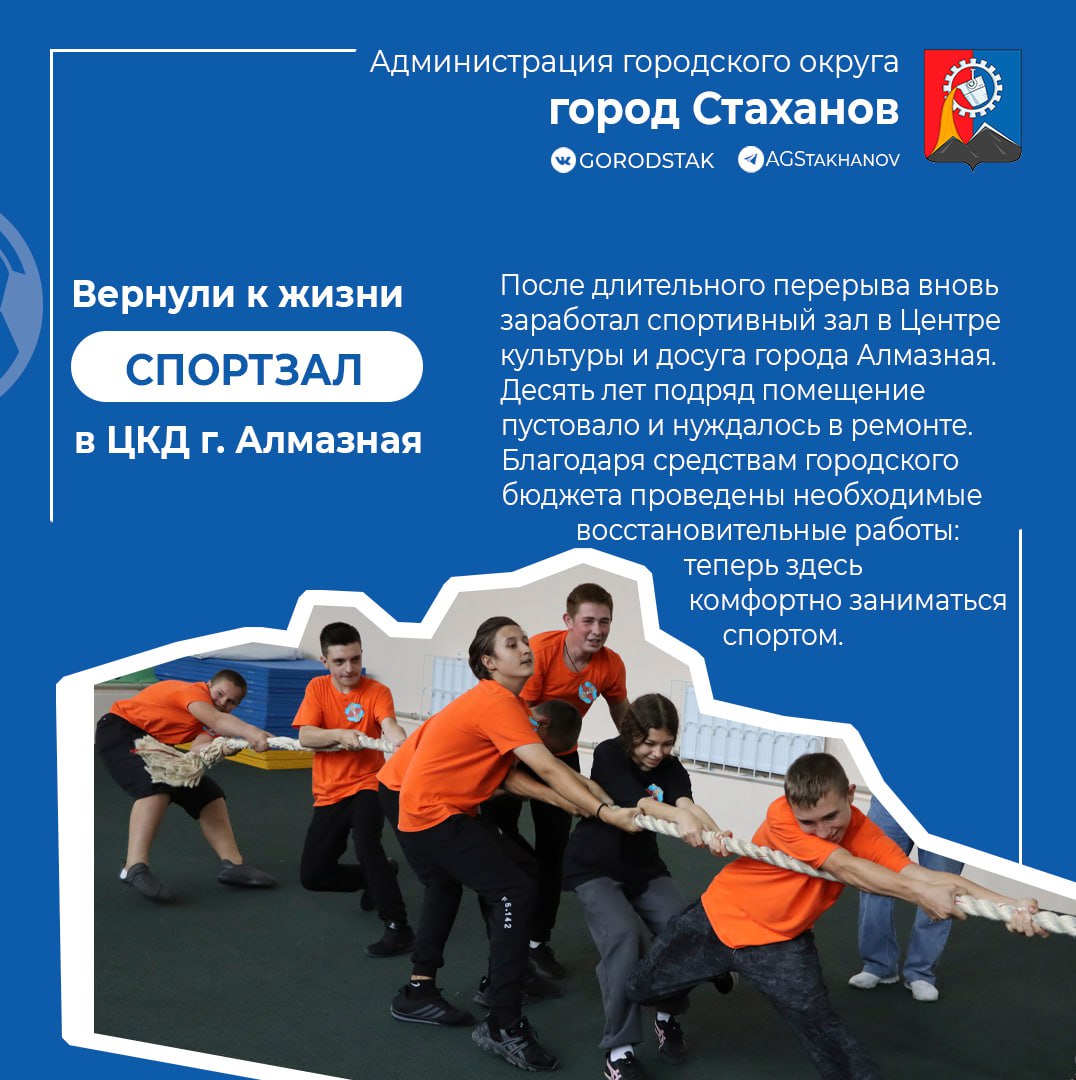 Вернули к жизни спортивный зал в ЦКД г. Алмазная, который 10 лет был закрыт, и отремонтировали залы в ДЮСШ.