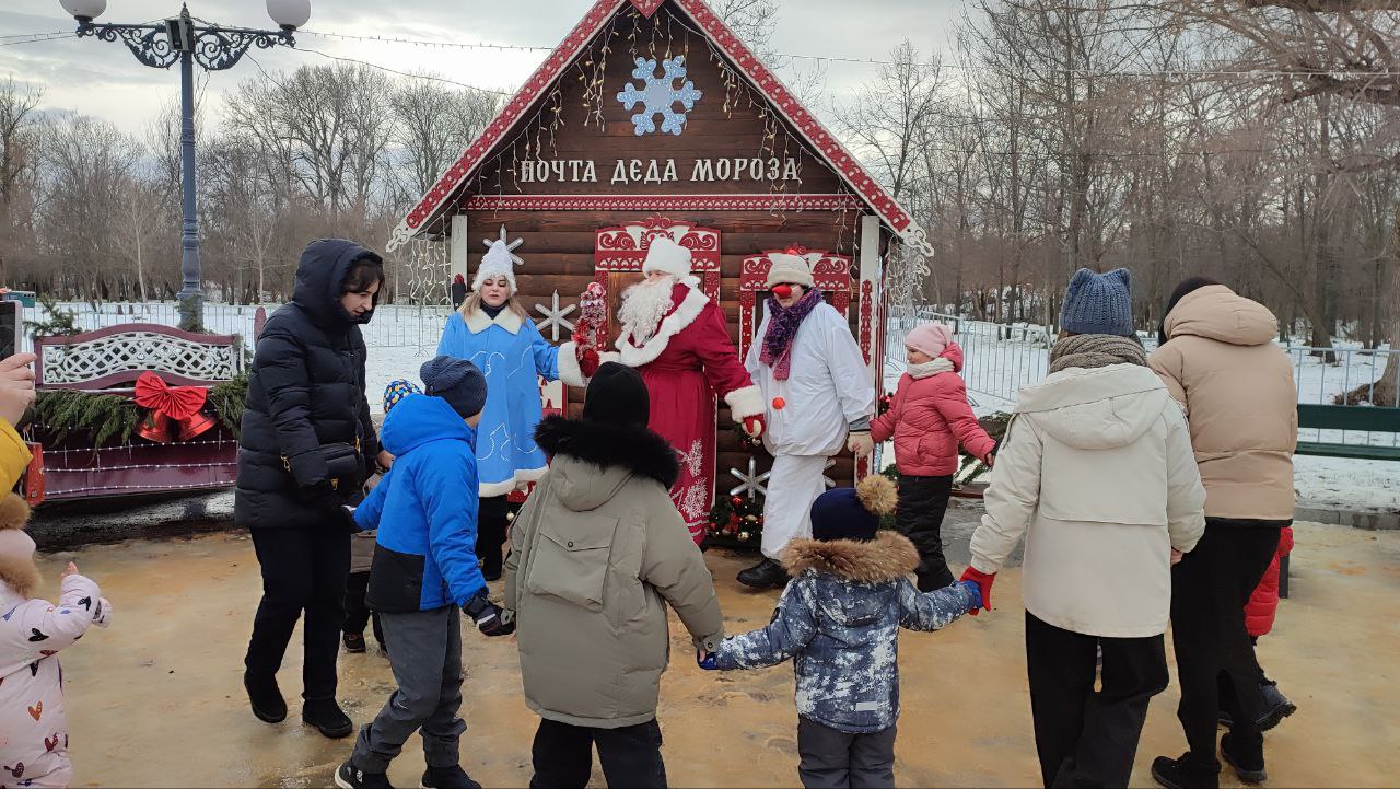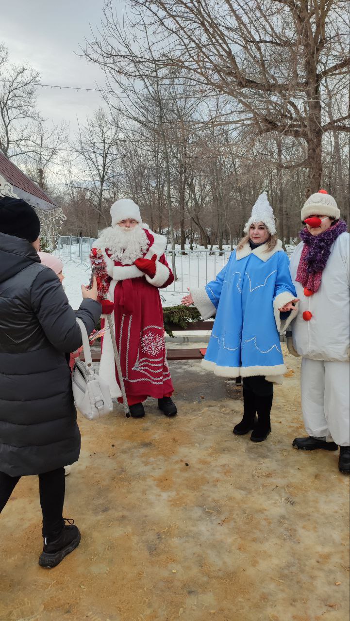 Дед Мороз. Снегурочка и Снеговик из МБУ "ДК им. Т. Г. Шевченко г. Александровска' в парке Горького возле домика Почта Деда Мороза проводили игровую программу с детьми.