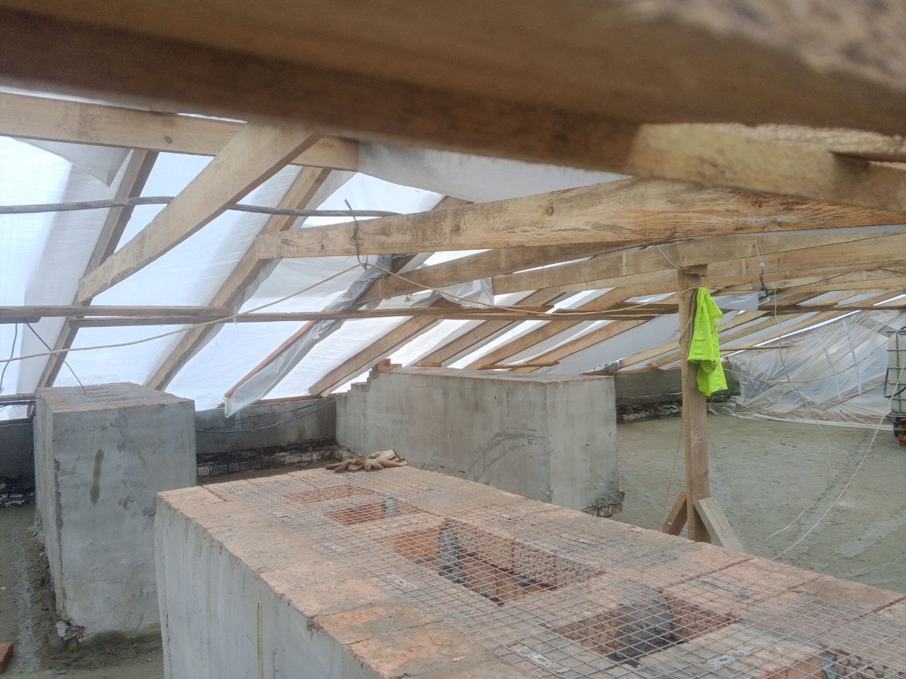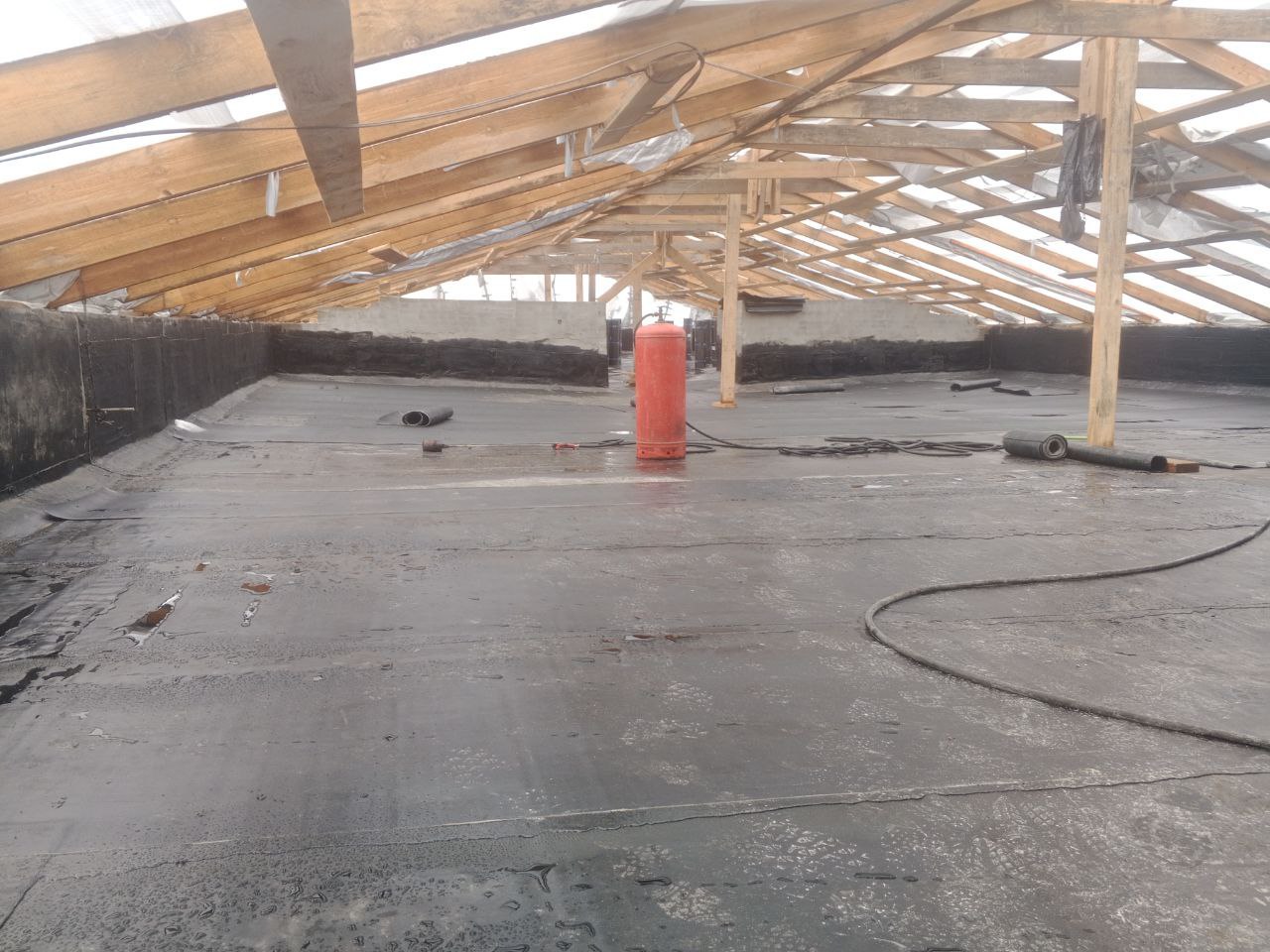 На текущем этапе ремонта уже возведены парапеты и вентиляционные шахты, которые затем были оштукатурены. Установлены водосточные воронки, а также уложены керамзит и монтажная сетка. На данный момент значительная часть кровли уже залита стяжкой, треть покрытия промазана праймером, и уложен первый слой мягкой кровли.