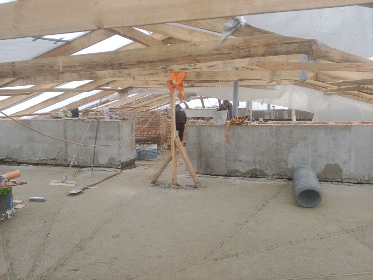 На сегодняшний день строители на другой части кровли продолжают укладку керамзита и монтажной сетки, а также проливают керамзит цементным раствором - это подготовительные работы перед заливкой стяжки. Все работы ведутся строго по графику, и их завершение запланировано на 2026 год.