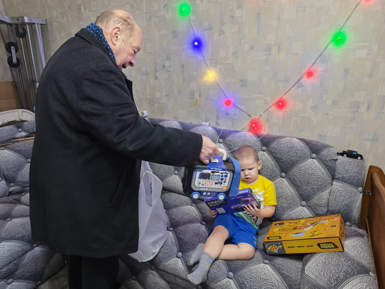 Сегодня, в канун Рождества, я вручил подарок Ярославу, которому всего 3 года. Он ещё только начинает разговаривать, но уже прекрасно понимает, что такое Новый год. Подарил ему машинки с автодорогой и чемоданчик с игрушечными инструментами. Дорогу ему помогут собрать родители, а сладкий подарок ребёнок сразу отдал маме и с энтузиазмом принялся играть с новыми игрушками.