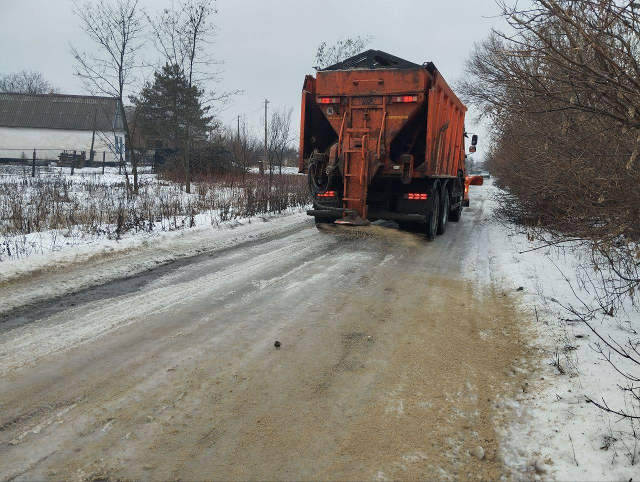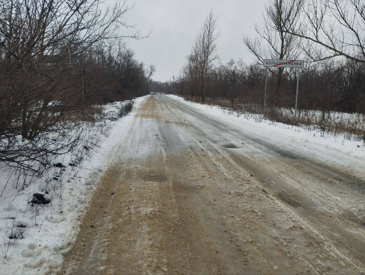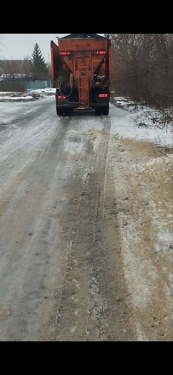 Сегодня работника МУП «ЖЭК» города Ровеньки боролись с гололедицей на автомобильных дорогах пгт Ясеновский, Большекаменка, Кленовый.