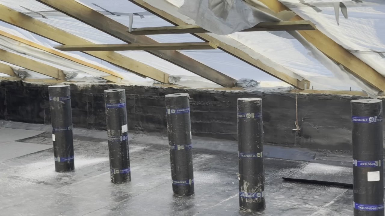 «На объекте уже завершена установка новых ливневок и современных воронок для эффективного сбора осадков. Эти элементы играют решающую роль в защите здания, так как правильно спроектированный водоотвод полностью исключает скопление влаги и предотвращает возникновение протечек, что крайне важно для долговечности мягкого кровельного покрытия.»