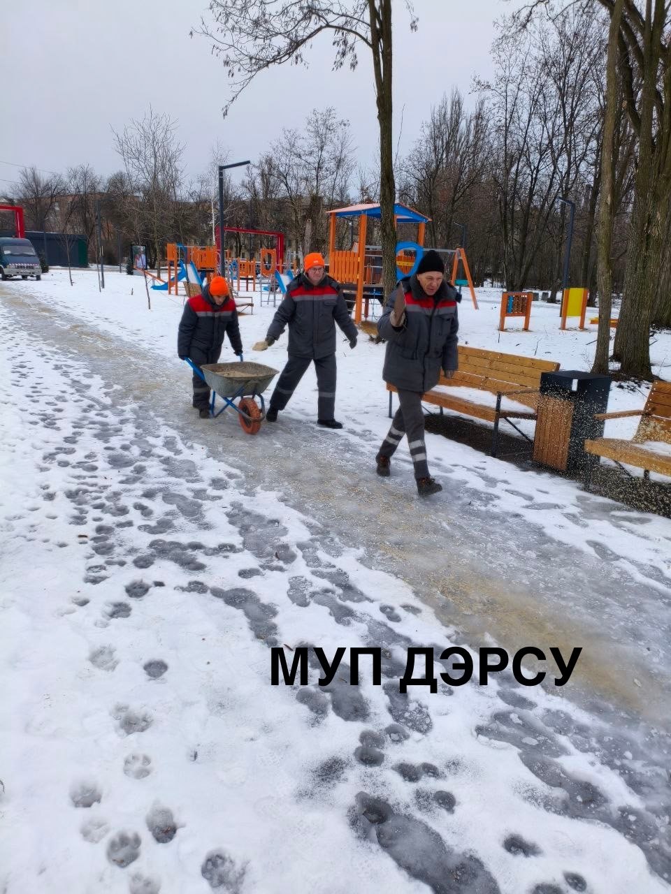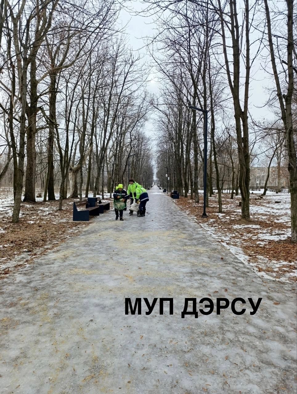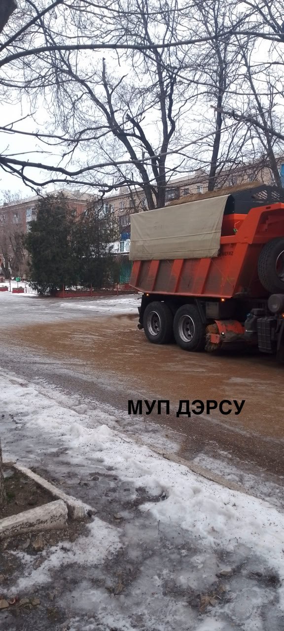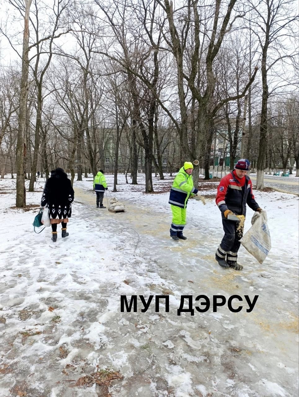 Не смотря на сложные погодные условия, постоянную смену температурного режима и обилие осадков, МУП "ДЭРСУ" продолжает активную работу по посыпке противогололедной смесью механизированным и ручным способом: