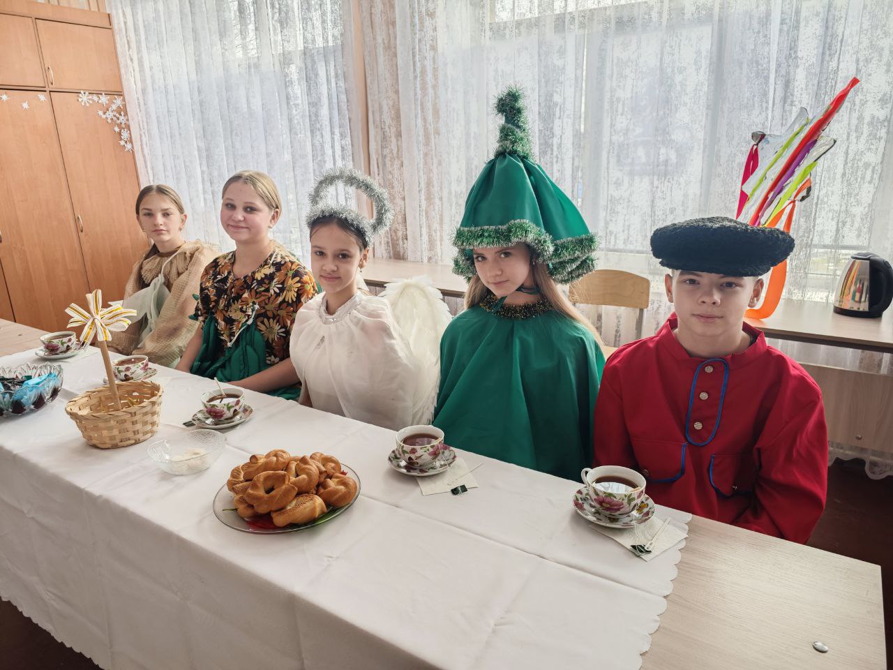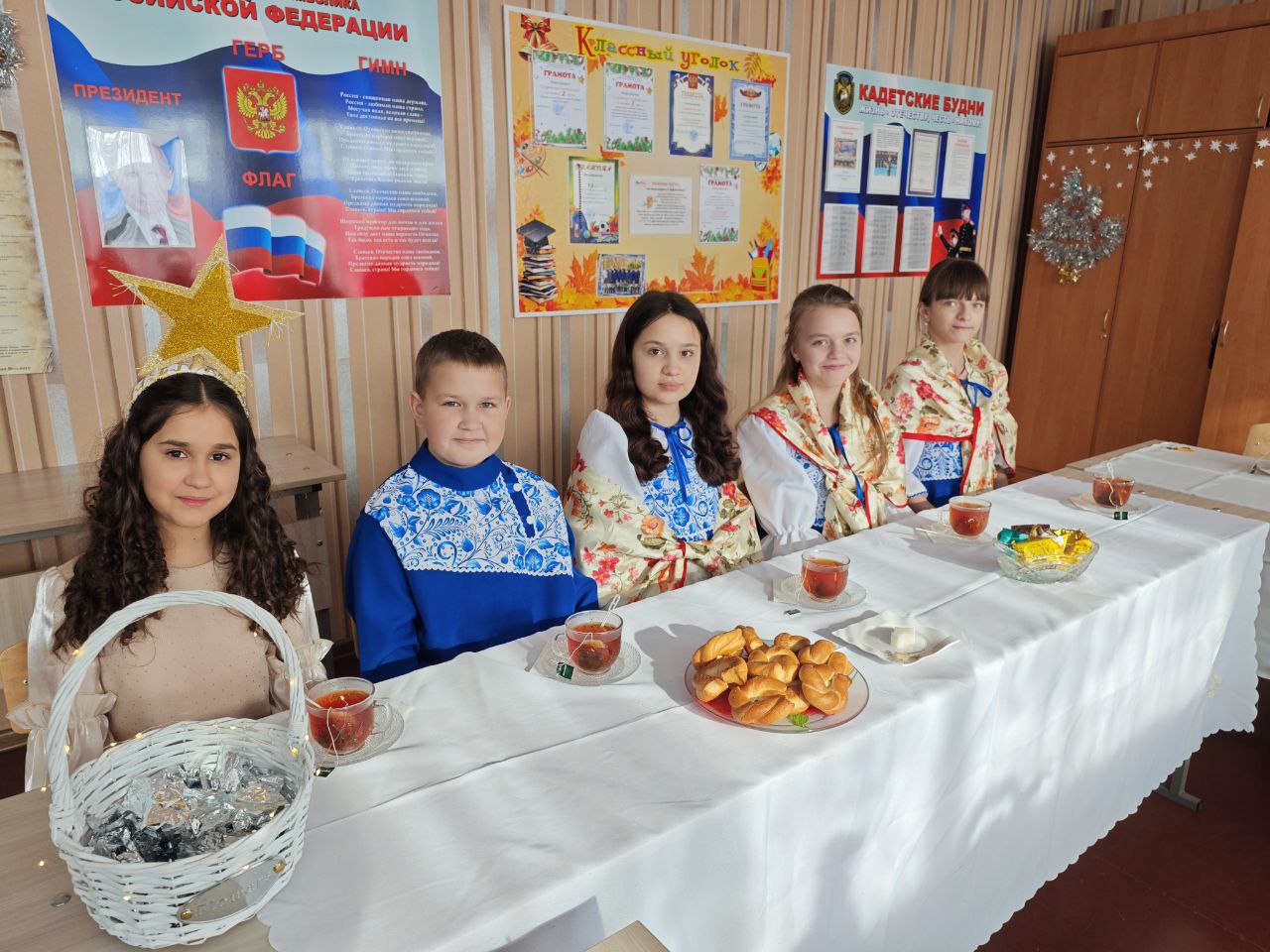 Программа началась с тёплого чаепития, особенно актуального в этот морозный день, где ученики и учителя обменивались поздравлениями.