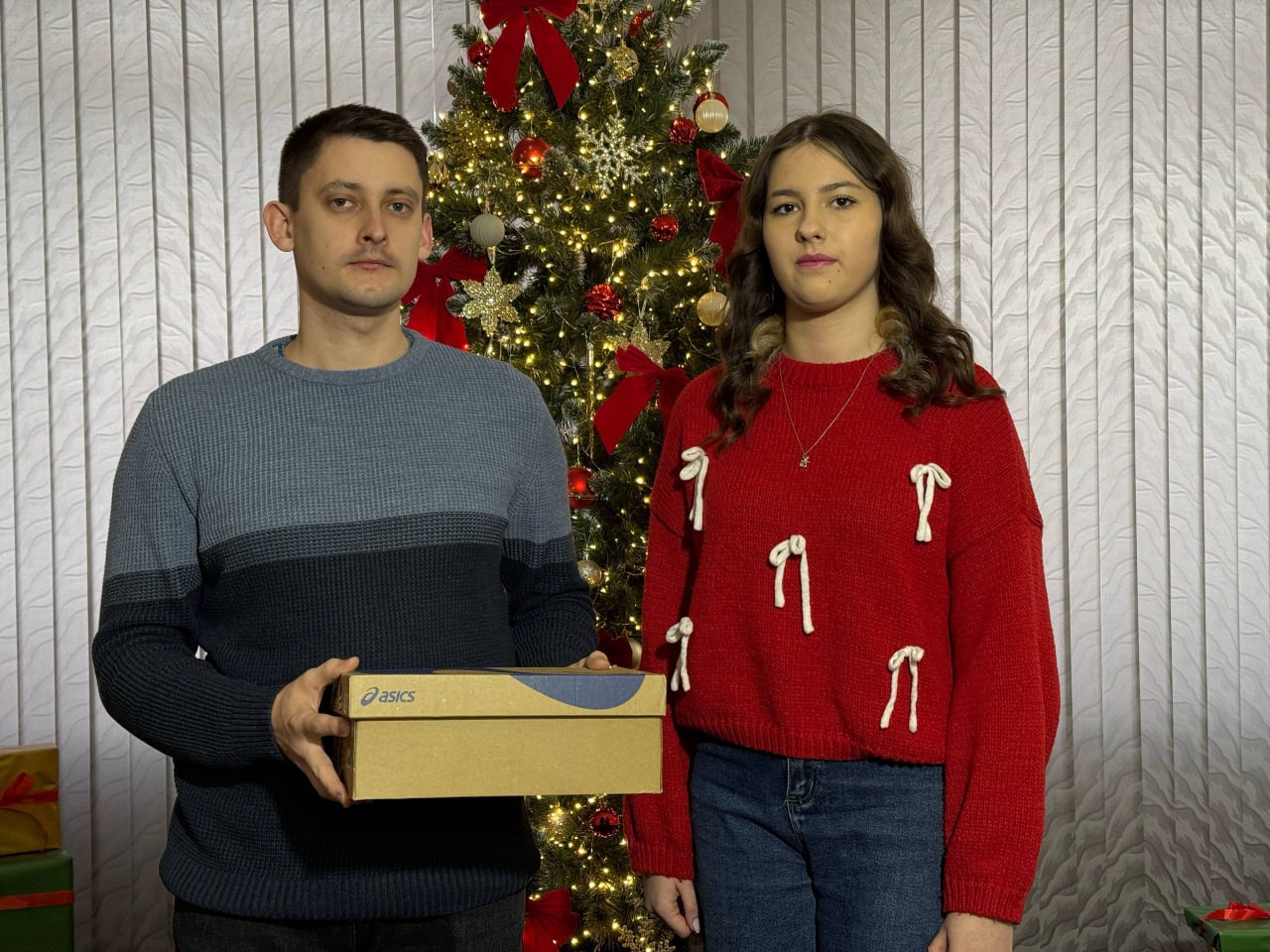 Представитель ИП Клепиков порадовал Веронику с Марковки, вручив ей профессиональные кроссовки для волейбола.