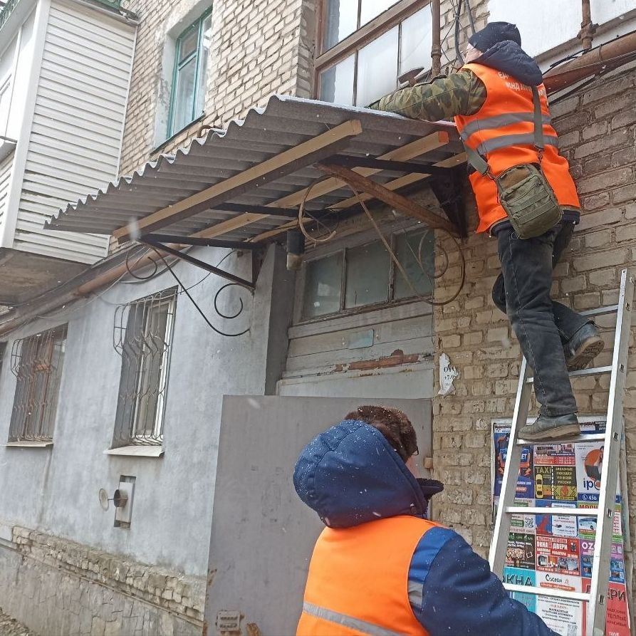 14 января в городе Молодогвардейске по адресу: ул. Молодежная, д. 17, велась замена покрытия козырьков входных групп.