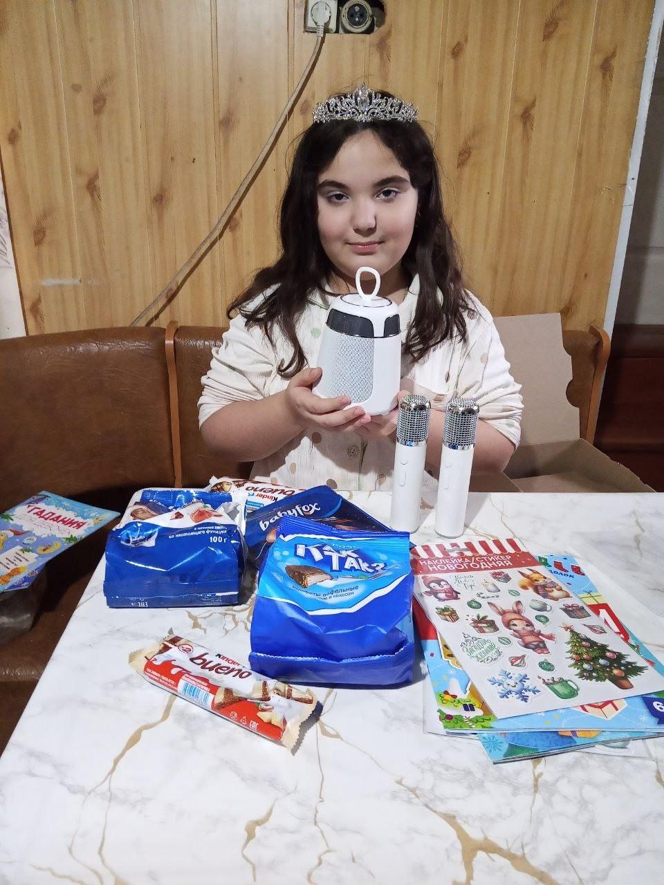 Поскольку Диана посещает музыкальную школу и очень любит петь, Елена Куратова отправила ей музыкальную колонку с двумя микрофонами, книжки-развивашки, сладости, а также письмо с рассказом о Сысольском районе и Республике Коми, пожеланиями мира и добра.