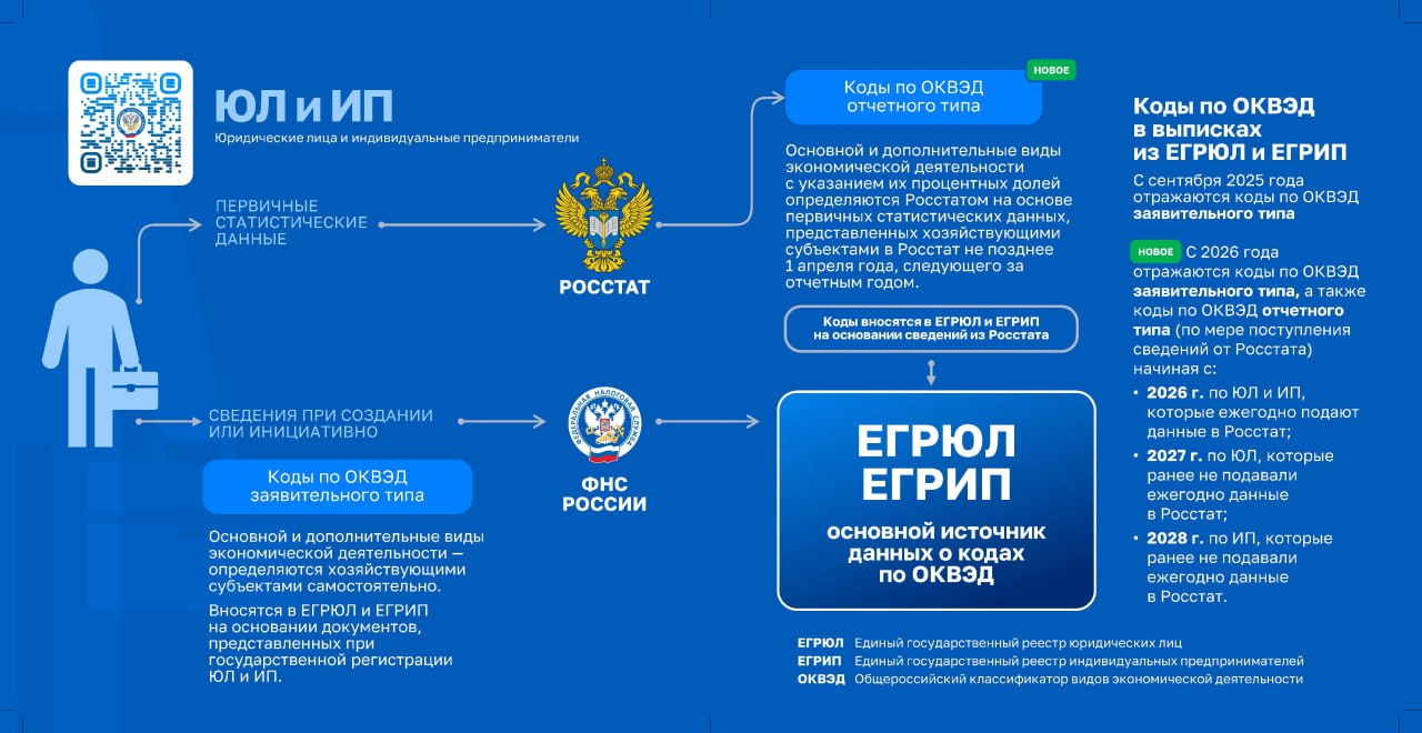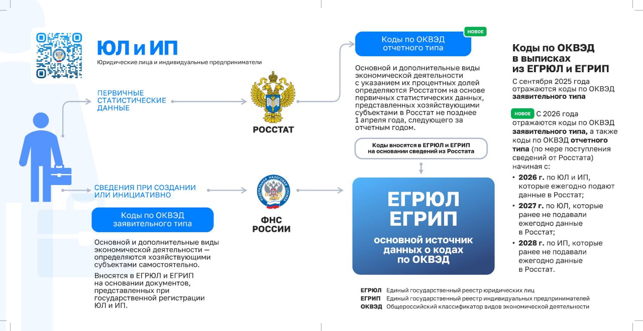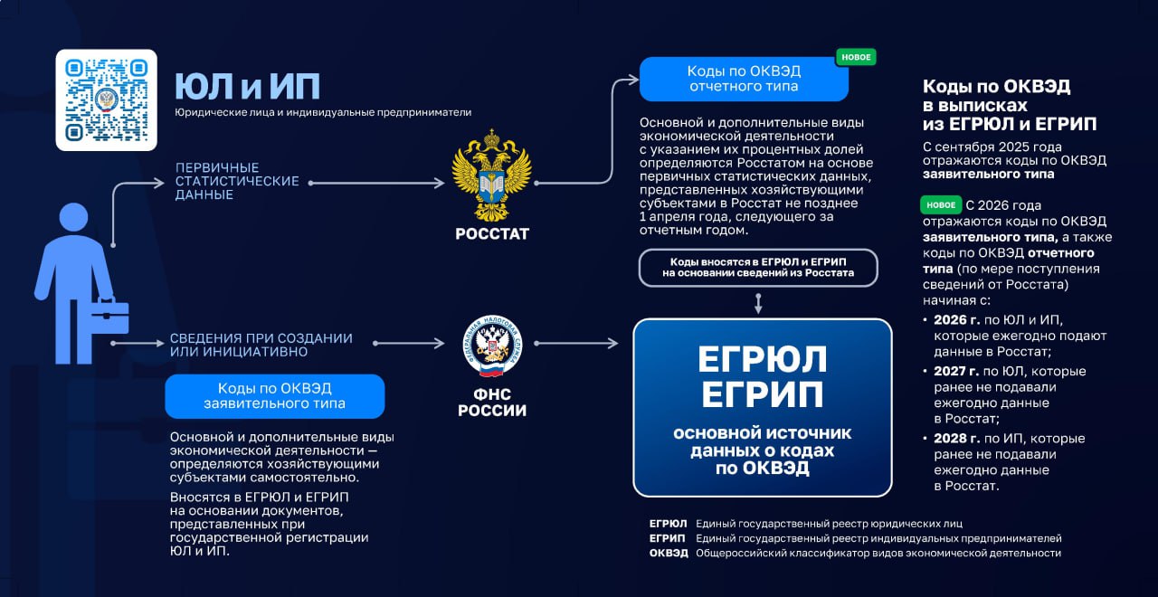 В реестрах ЕГРЮЛ и ЕГРИП теперь содержатся два типа кодов по ОКВЭД: заявительные и отчетные. Первые определяются хозяйствующим субъектом самостоятельно и вносятся в ЕГРЮЛ и ЕГРИП в соответствии с документами, представленными при государственной регистрации. Они отражаются в выписках из ЕГРЮЛ и ЕГРИП с сентября 2025 года.
