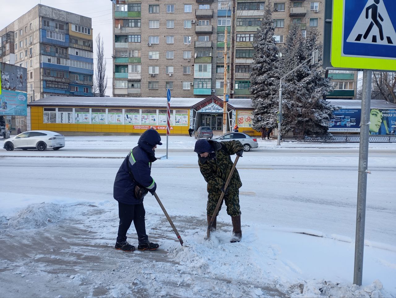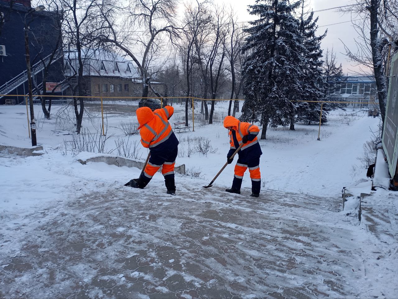 Пока техника работает на главных дорогах, самые ответственные и сложные участки доверяем нашим дорожникам. Пешеходные переходы, ступеньки, аллеи — всё это требует внимания человеческих рук.