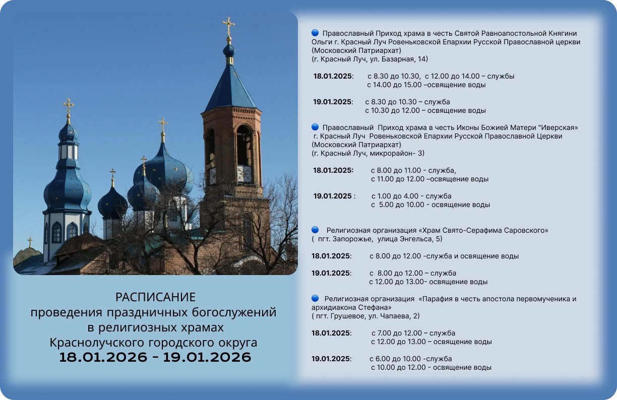 Информация о проведении праздничных богослужений в религиозных храмах Краснолучского городского округа Луганской Народной Республики 18-19 января 2026 года (Крещение Господне)