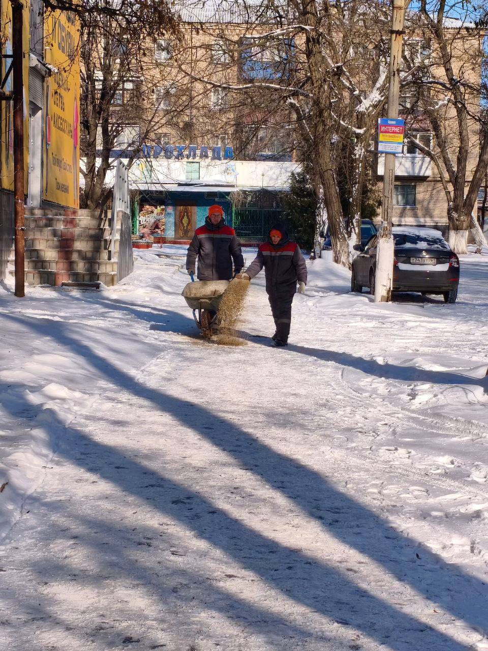 Коммунальные службы работают в усиленном режиме: расчищаются дороги, остановки, пешеходные зоны и подъезды к социальным объектам.