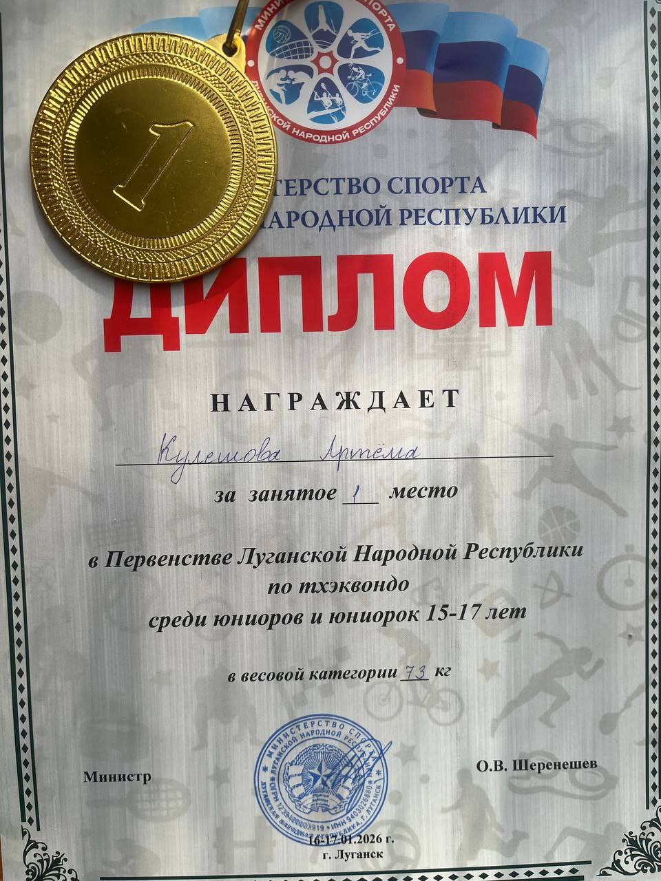 Ученик 11 класса "Зимогорьевской средней школы имени Ивана Малько", спортсмен спортивного клуба "Лугань" Артём Кулешов одержал победу на Первенстве Луганской Народной Республики по тхэквондо среди юниоров 15-17 лет.