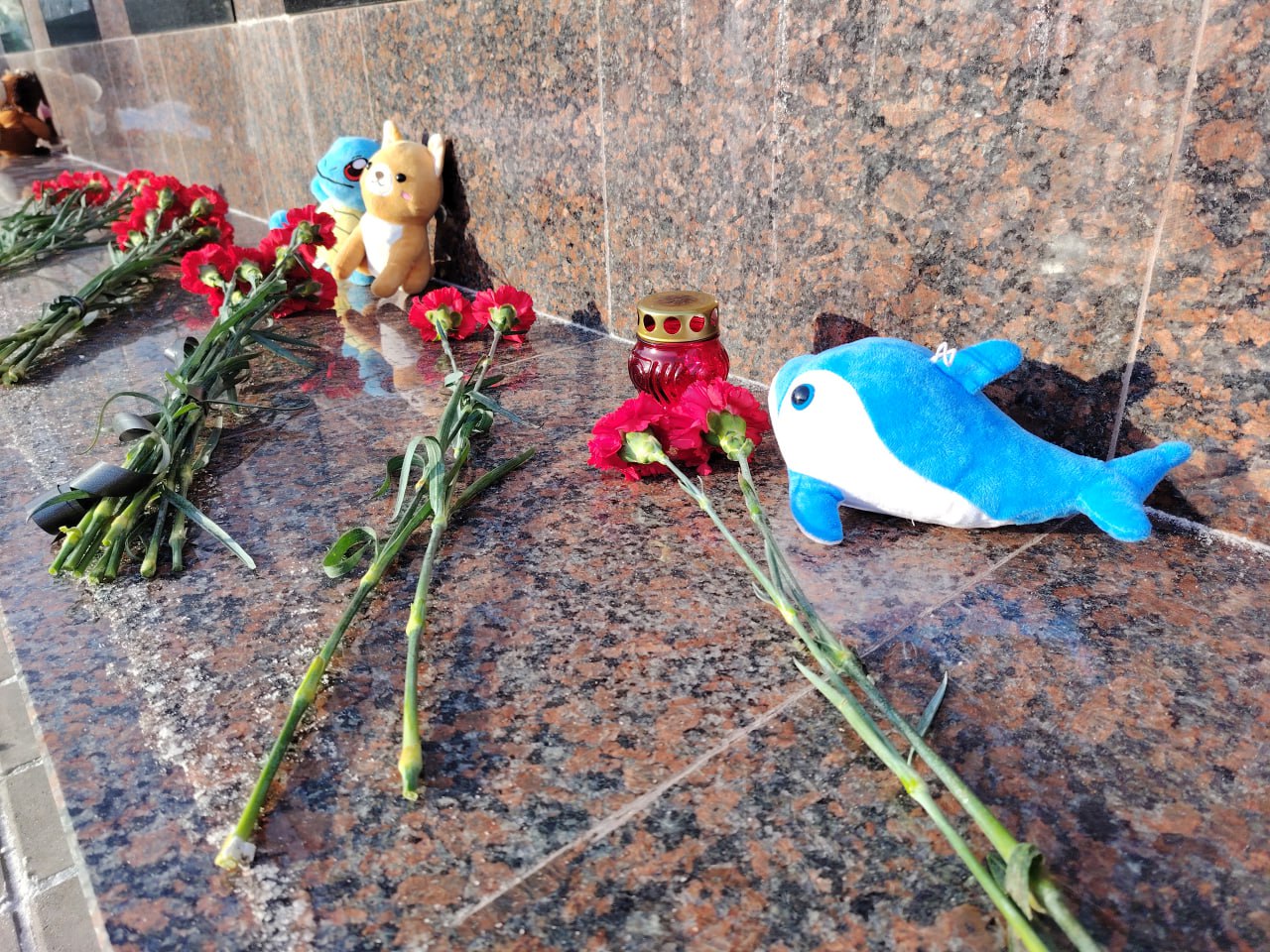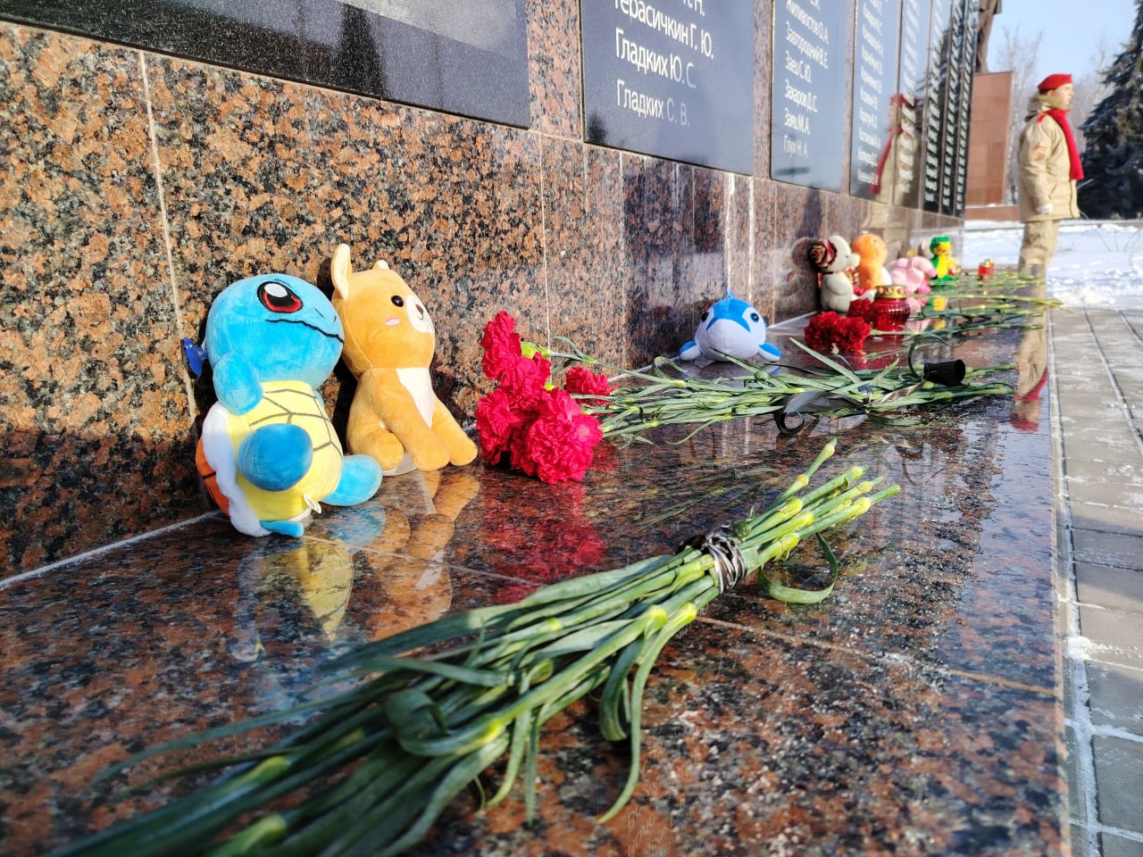 Возложение цветов и детских игрушек прошло тихо и сосредоточенно. Участники почтили память погибших минутой молчания.