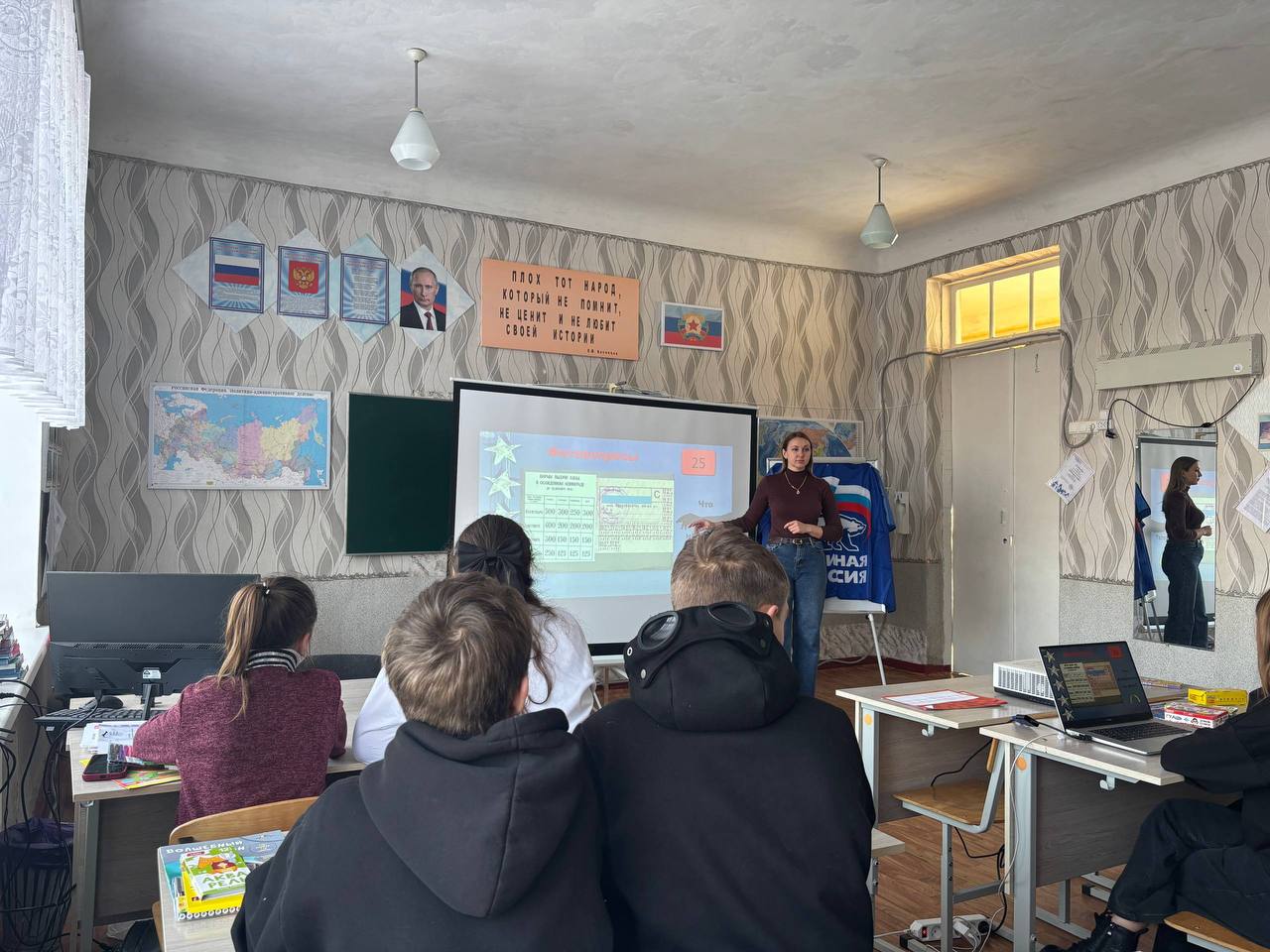 Елена Прудникова, председатель комиссии по патриотическому воспитанию и член молодежного парламента при народном совете ЛНР, напомнила ребятам о ключевых датах и переломных моментах битвы за Ленинград. Кульминацией урока стала динамичная квиз-викторина. Разделившись на команды, почти 20 старшеклассников с энтузиазмом отвечали на вопросы, касающиеся стратегических операций, "Дороги жизни", памятных монументов, посвященных блокаде. Ребята продемонстрировали отличные знания истории и уважение к подвигу предков.