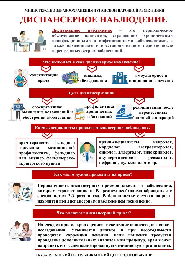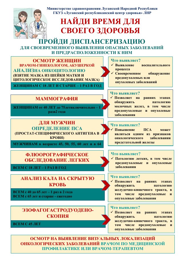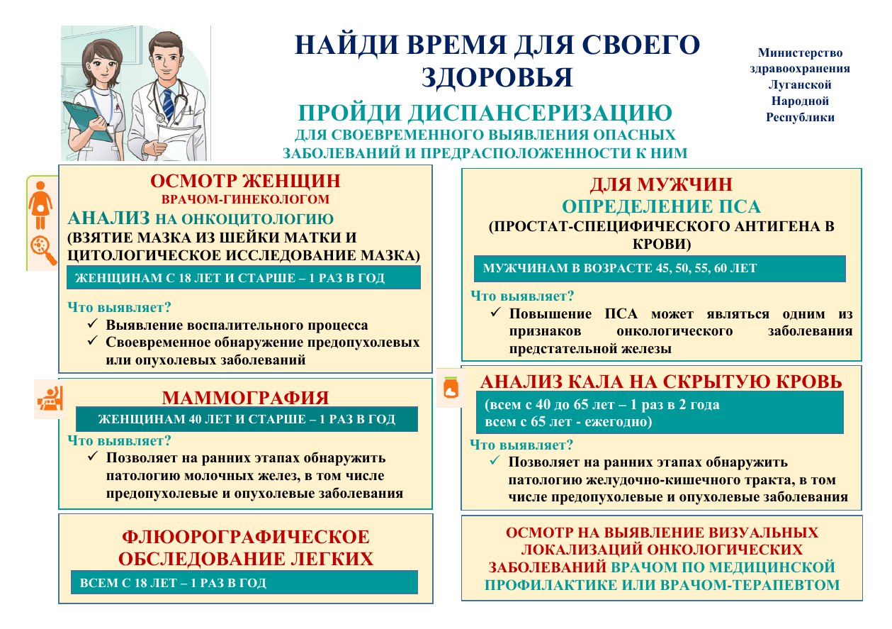 Министерство здравоохранения Луганской Народной Республики информирует о важности прохождения профилактических осмотров и диспансеризации определенных групп взрослого населения. Читайте подробно в карточках