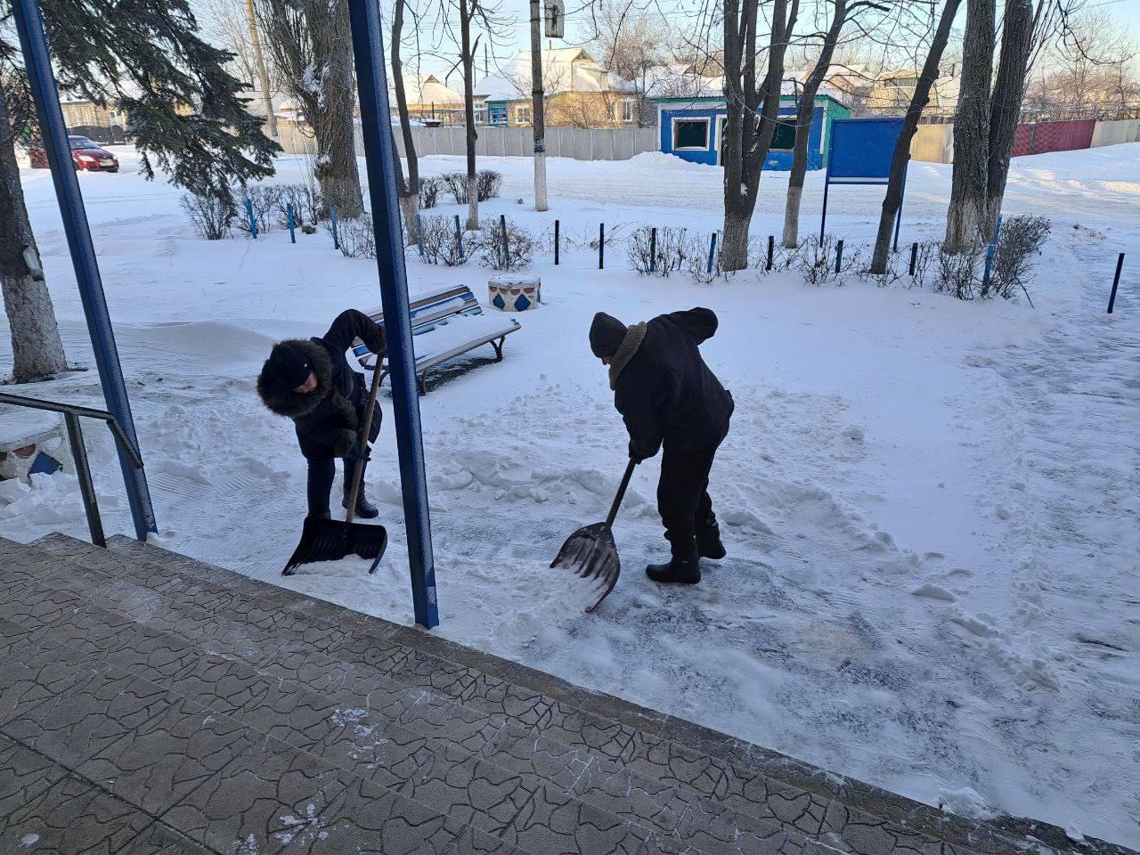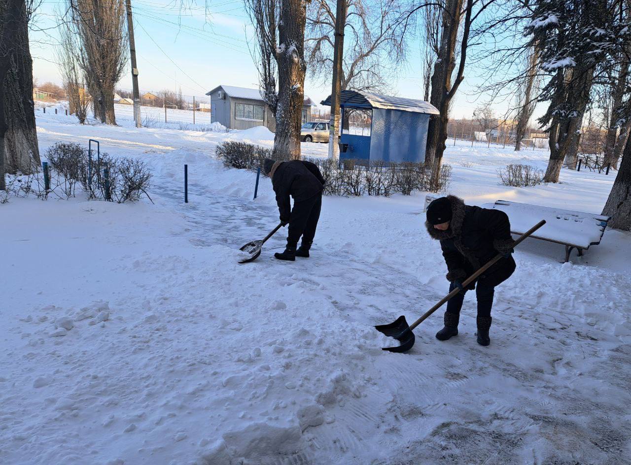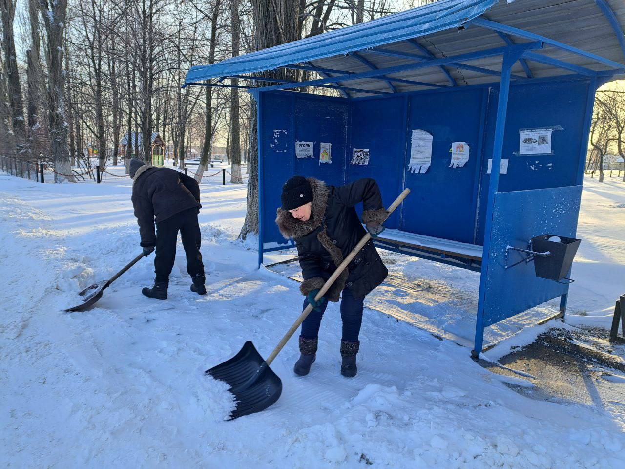 Сегодня работниками отдела жизнеобеспечения пгт Ясеновский Администрации городского округа город Ровеньки выполнены работы по расчистке от снега ручным способом территории, прилегающей к зданию отдела, и остановок общественного транспорта по улице Ленина.
