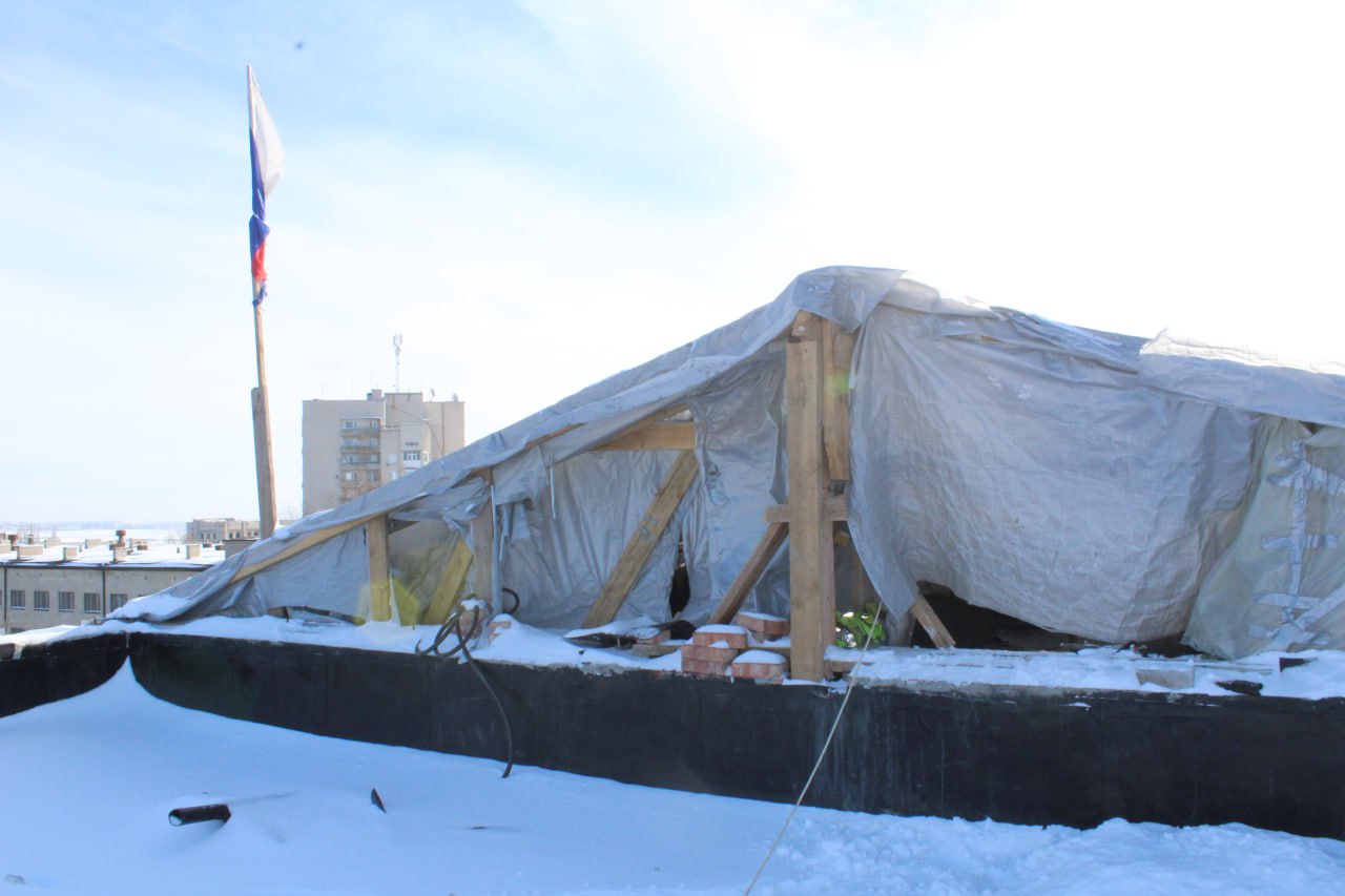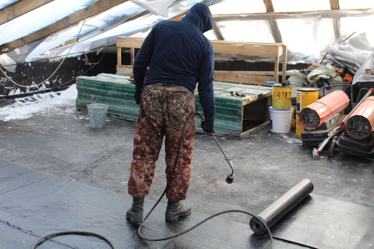 Для обеспечения бесперебойного хода работ, несмотря на погодные условия, над кровлей специалистами СК "СТИЛ" был установлен специальный защитный шатер. Такой подход защищает от осадков и ветра, позволяя мастерам работать в комфортных условиях. Кроме того, для поддержания необходимого температурного режима на объекте используются дизельные пушки.