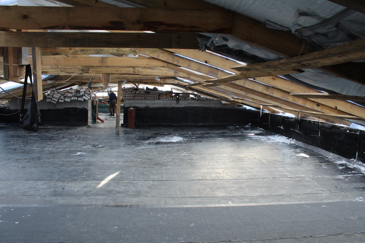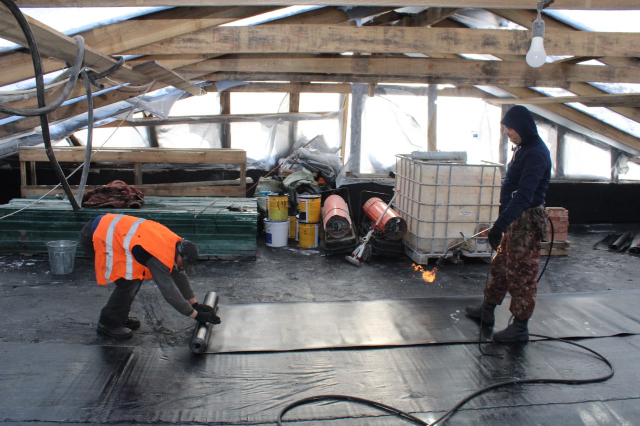 На некоторых подъездах уже завершена пайка мягкой кровли, временный шатер был демонтирован, и сейчас ведутся подготовительные работы для установки ограждения по периметру и монтажа грибков над вентиляционными каналами. В другой части здания под защитным шатром продолжается пайка первого и второго слоев кровли.