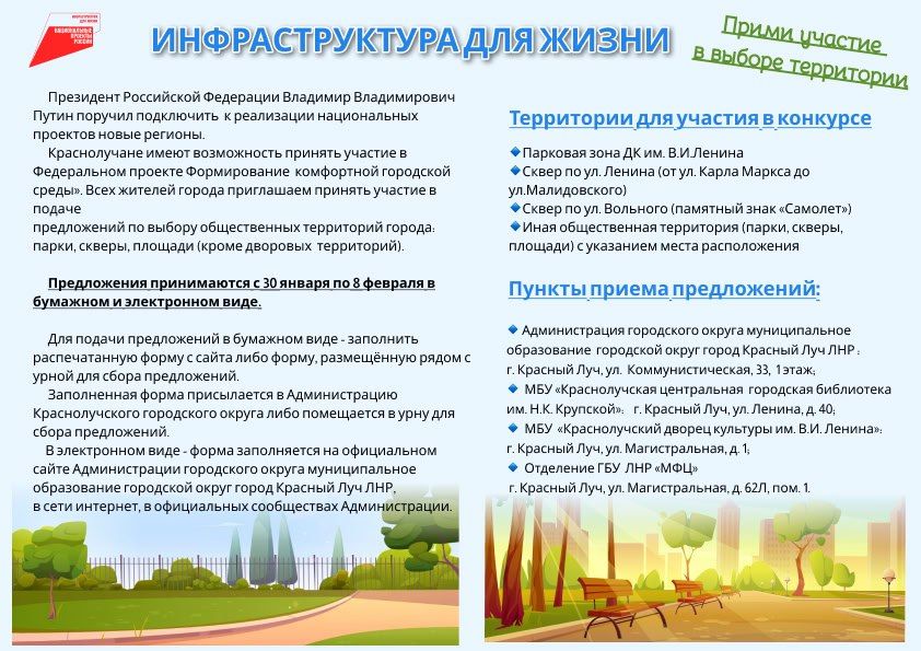Краснолучане имеют возможность принять участие в Федеральном проекте Формирование комфортной городской среды». Всех жителей города приглашаем принять участие в подаче предложений по выбору общественных территорий города: парки, скверы, площади (кроме дворовых территорий).
