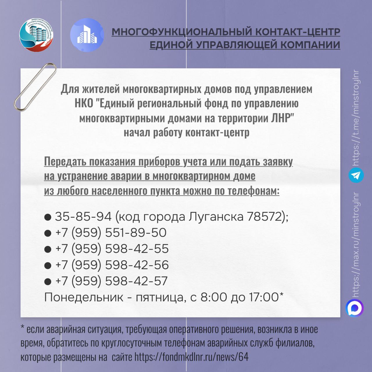 Для жителей многоквартирных домов, находящихся в управлении НКО «Единый региональный фонд по управлению многоквартирными домами на территории ЛНР», начал работу многофункциональный контакт-центр.