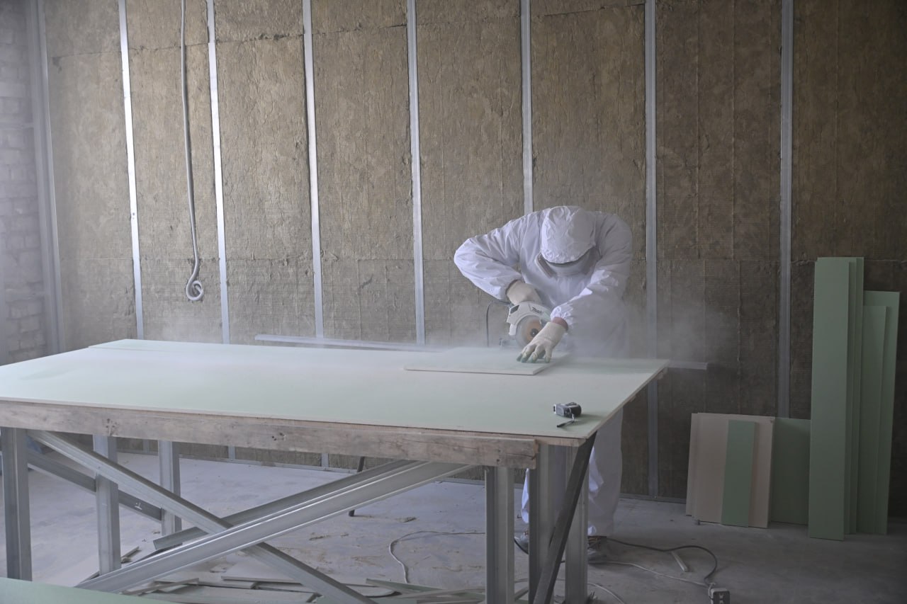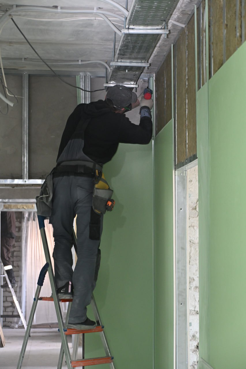 Уже сегодня, войдя в здание, видишь масштаб проделанной работы. За период новогодних праздников объект разительно изменился. На всех трёх этажах идут полным ходом внутренние работы: монтируется каркас, укладывается плитка, прокладываются новые системы электроснабжения, водопровода и канализации.