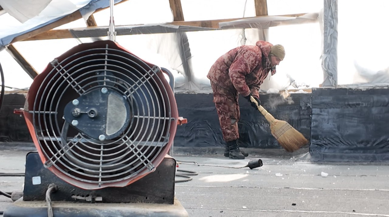 На некоторых подъездах уже завершены основные работы. В настоящее время ведется демонтаж шатра, который был установлен для обеспечения бесперебойного хода работ. Он защищал кровлю от дождя и ветра, создавал комфортные условия для работы строителям. Для поддержания необходимого температурного режима на объекте используются дизельные пушки. Также, выполняется обшивка вентиляционных каналов. Это предотвратит негативное воздействие внешних факторов и защитит стенки каналов от разрушения из-за конденсата. Идут подготовительные работы для установки ограждения.
