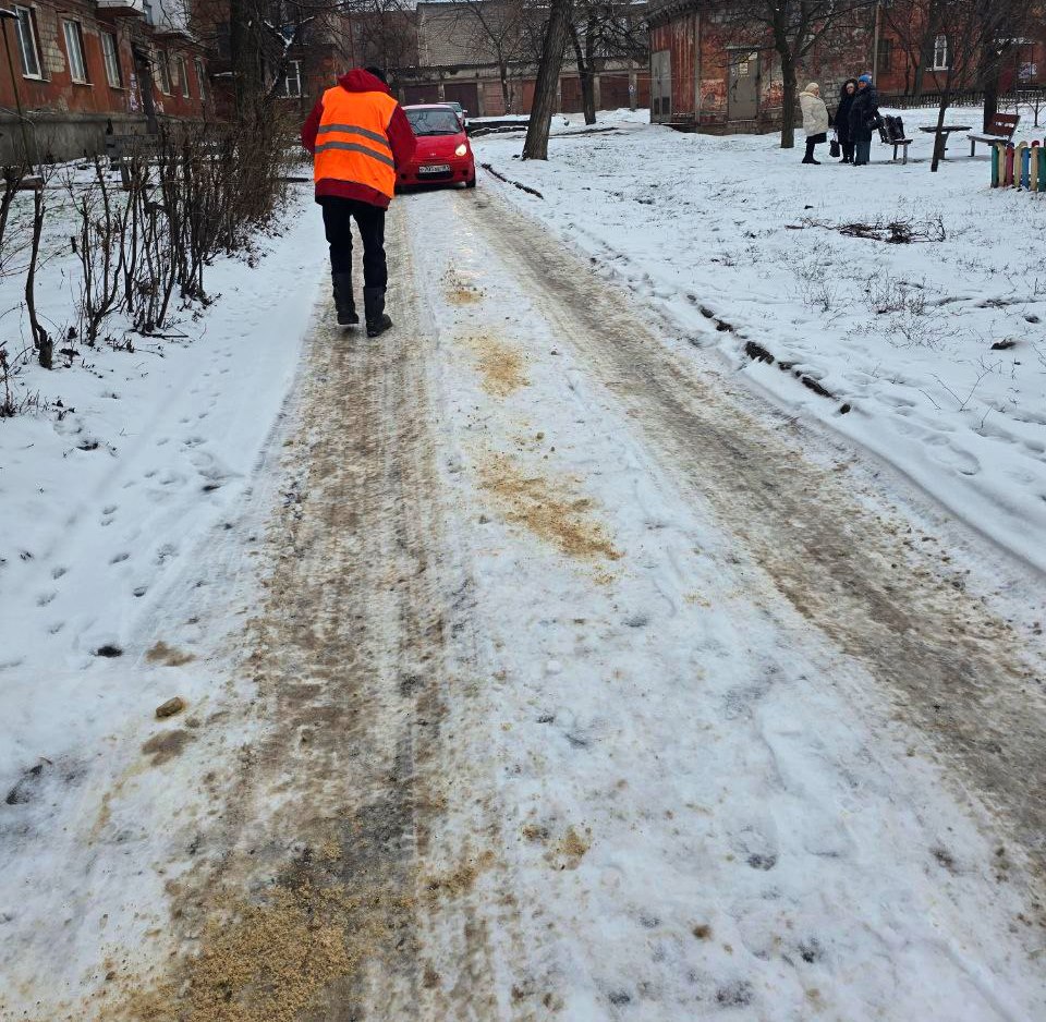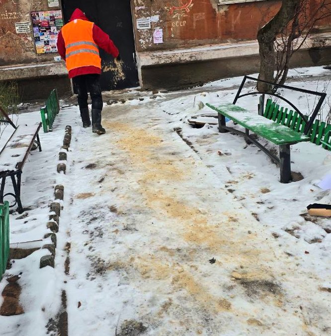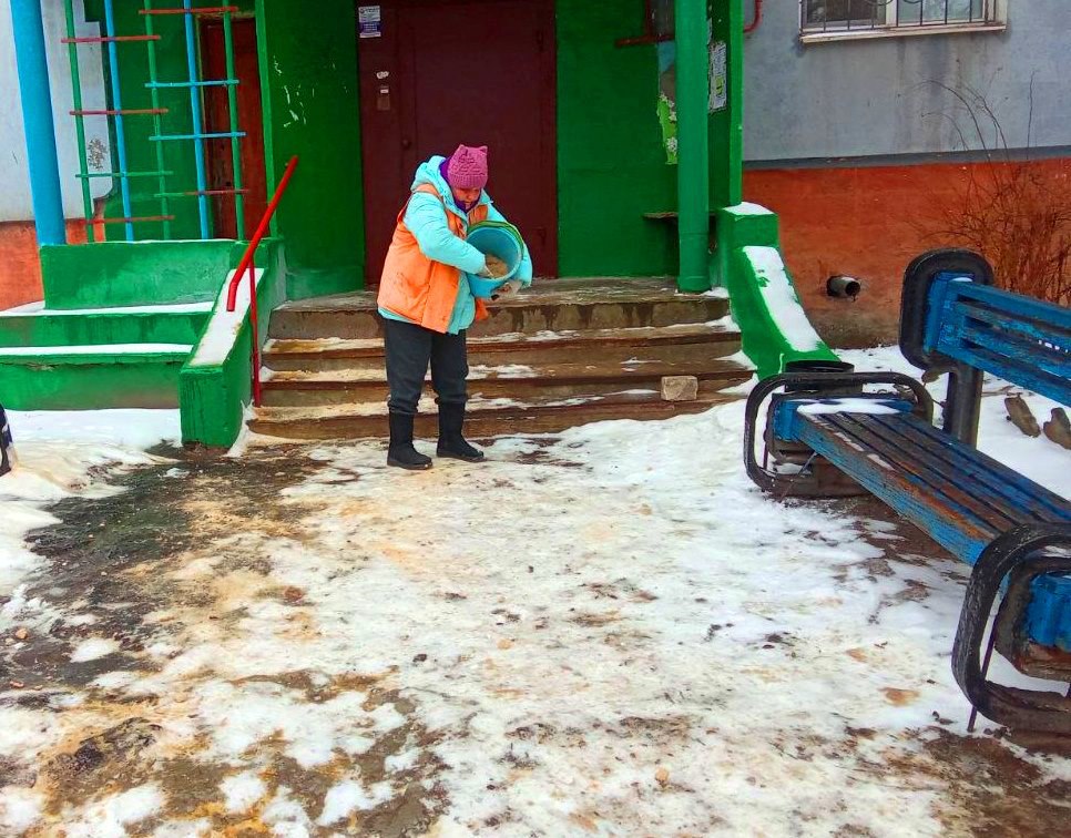 Специалисты Алчевского филиала Единой управляющей компании ведут работы по обработке противогололедными материалами на придомовых территориях в микрорайонах города, посыпают подходы к подъездам, пешеходные дорожки.