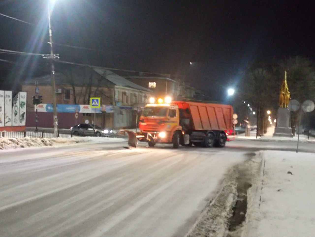 МУП "СКАТ" вечером работает на автомобильных дорогах города Ровеньки, чтобы предотвратить образование новой наледи ночью.