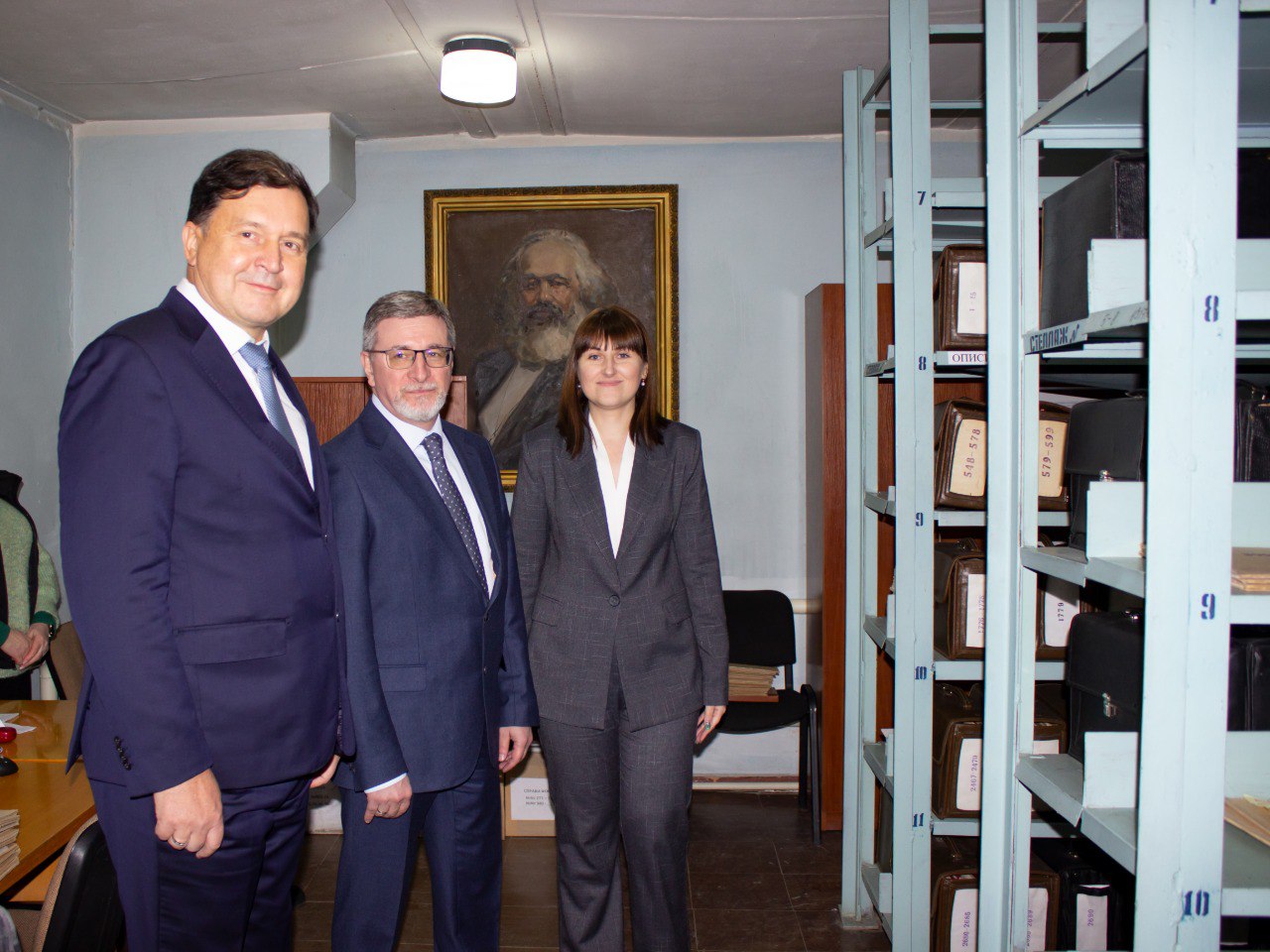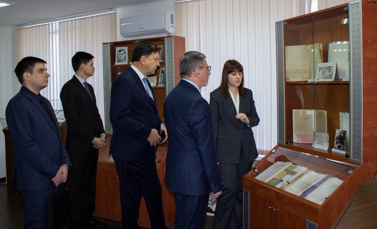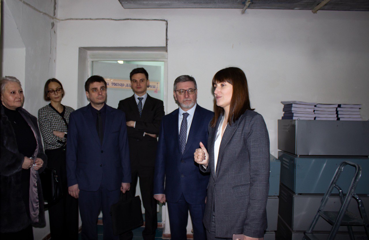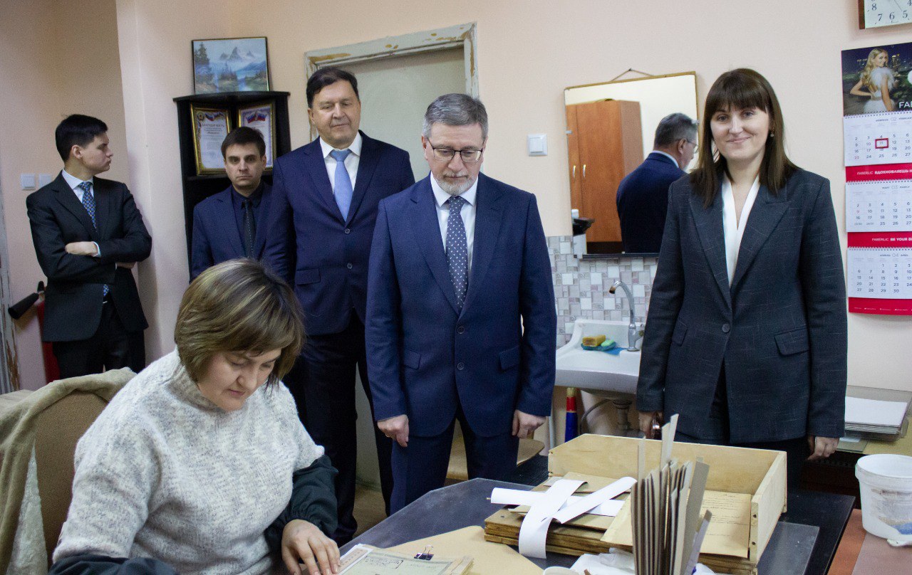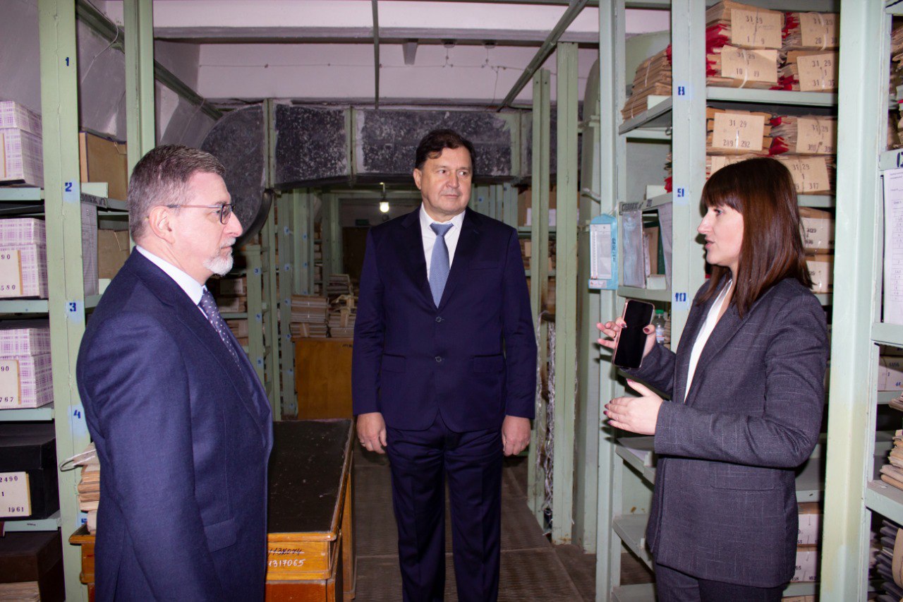 Начальник Управления материально-технического обеспечения Управления делами Президента РФ Владимир Луньков, начальник отдела Управления материально-технического обеспечения Василь Набиуллин, генеральный директор Президентской библиотеки им. Б.Н. Ельцина Юрий Носов, заместитель генерального директора Президентской библиотеки им. Б.Н. Ельцина Андрей Зайцев, директор департамента Президентской библиотеки им. Б.Н. Ельцина Валерия Малаховская увидели, как обеспечивается физическая сохранность архивных документов, ознакомились с системой хранения документов и фондами ГКУ Госархив ЛНР, где на сегодняшний день хранится более 2 млн единиц хранения.