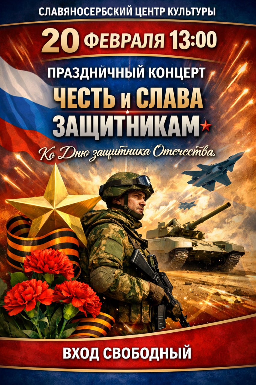 Приглашаем всех жителей и гостей Славяносербского муниципального округа принять участие в праздничном концерте «ЧЕСТЬ И СЛАВА ЗАЩИТНИКАМ», посвященном Дню защитника Отечества!
