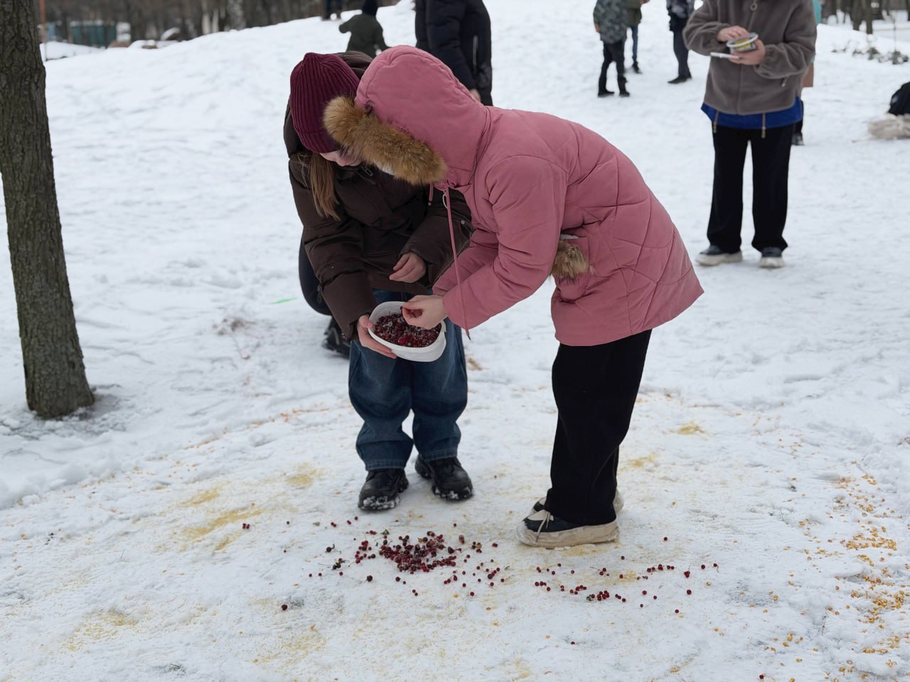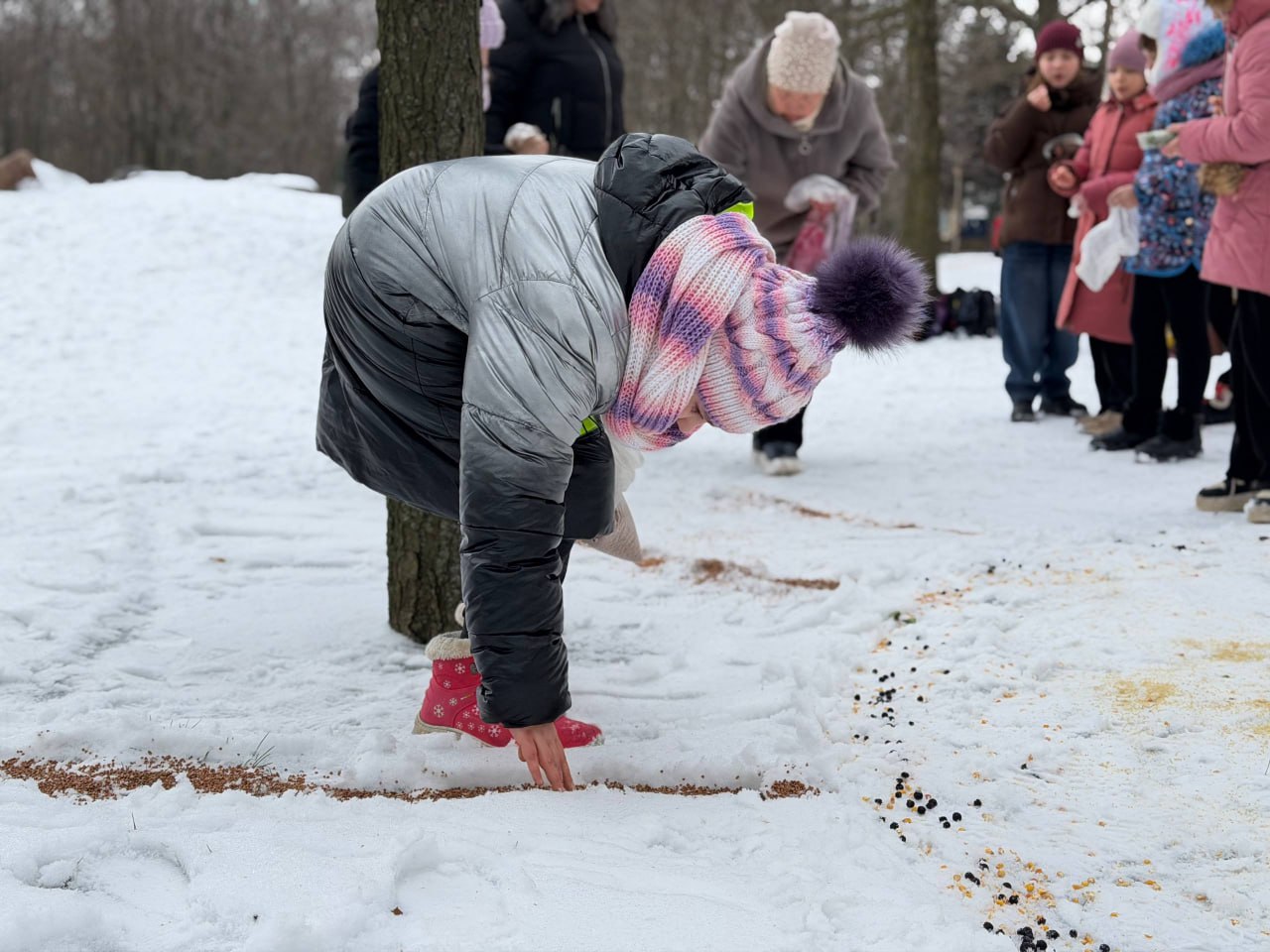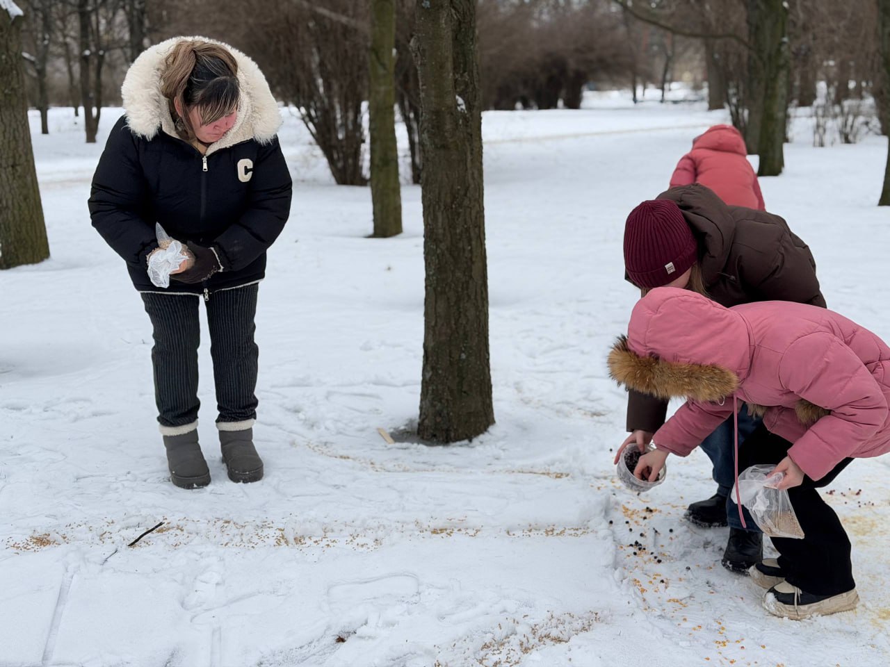 В зимний период, когда птицам, обитающим в парке имени Чихачева, трудно найти корм из-за снега и льда, ребята решили прийти им на помощь.