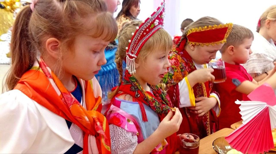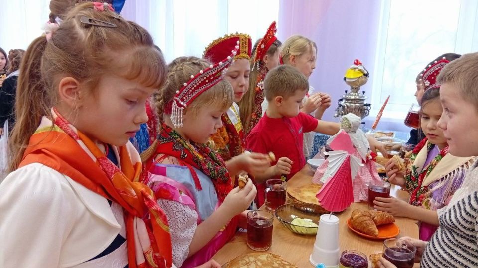 После активных игр и веселья всех ждало традиционное угощение. За большим столом, дети отведали румяных блинов — главного символа Масленицы. Ароматный чай создавал атмосферу настоящего семейного праздника.
