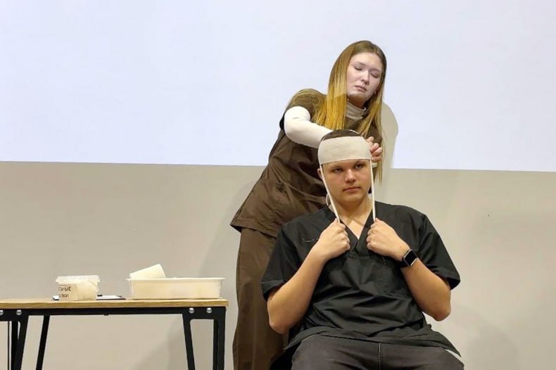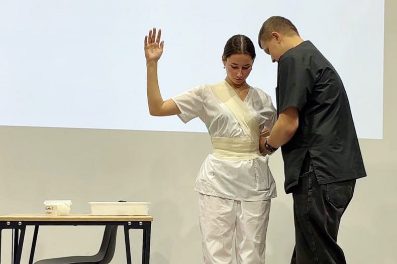 Студенты колледжа показали различные способы наложения повязок, подробно разъяснили их цели и порядок выполнения.