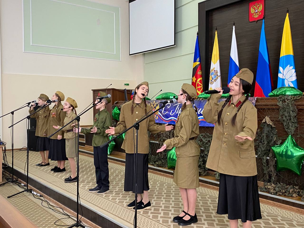 Мероприятие началось с Государственного гимна, который исполнил хор Антрацитовской детской музыкальной школы и торжественного выноса копии Знамени Победы.