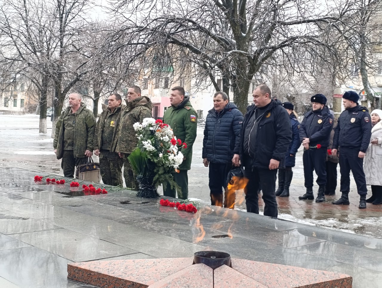 Завершилось торжественное мероприятие возложением цветов к Вечному огню и памятнику участникам СВО. Минутой молчания почтили память погибших.